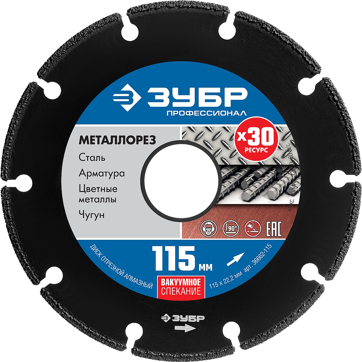 ЗУБР МЕТАЛЛОРЕЗ 115 мм, вакуумное спекание, 22.2 мм, алмазный диск, ПРОФЕССИОНАЛ (36662-115)