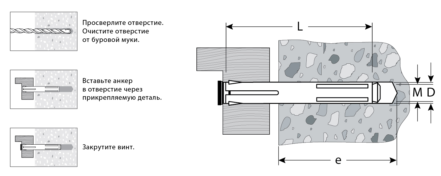 Для крепления оконных рам и дверных коробок к полнотелым основаниям: поверхностям из бетона, полнотелого кирпича или природного камня. Анкер устанавливается в предварительно просверленное и очищенное от буровой муки отверстие, расклинивание происходит при закручивании винта. Минимальная глубина анкеровки - 30мм. Минимальная глубина сверления (е) - 50мм. Для установки анкера требуется бита PZ3.