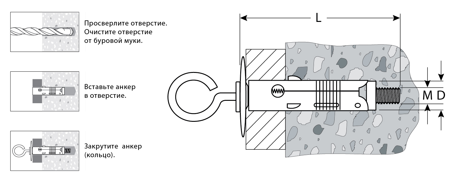 Для крепления проушин, тросов, цепей, подвесных конструкций к полнотелым основаниям: поверхностям из бетона, полнотелого кирпича или природного камня. Анкер устанавливается в предварительно просверленное и очищенное от буровой муки отверстие диаметром 8мм и глубиной не менее 55мм, расклинивание происходит при закручивании полукольца с резьбовым стержнем