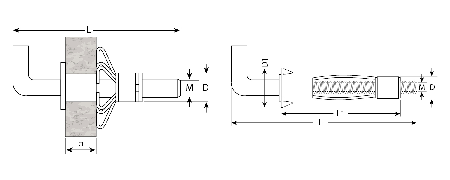 Для крепления различных конструкций к пустотелым стеновым панелям, гипсокартону, ДСП, гипсоволоконным листам (ГВЛ), потолочным покрытиям с пустотами. Анкер устанавливается в предварительно просверленное и очищенное от буровой муки отверстие.