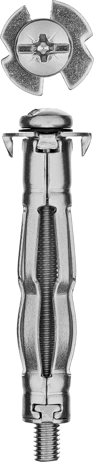 Для крепления различных конструкций к пустотелым стеновым панелям, гипсокартону, ДСП, гипсоволоконным листам (ГВЛ), потолочным покрытиям с пустотами. Установка анкера производится при помощи заклепочника для анкеров. Винт анкера имеет шлиц PH&SL.