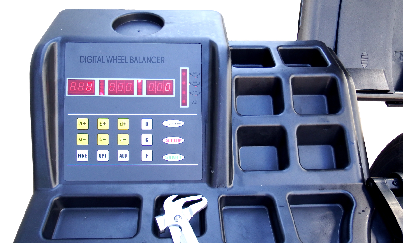 В комплекте поставки есть все необходимые инструменты и аксессуары: 4 конуса, балансировочные клещи, измерительный кронциркуль, быстрая гайка и калибровочный грузик 100 гр.