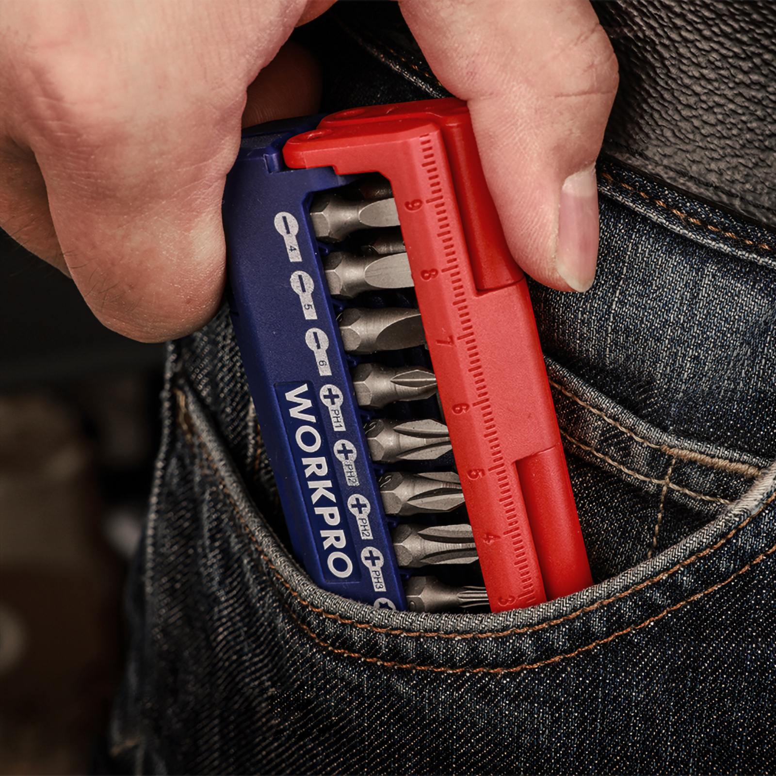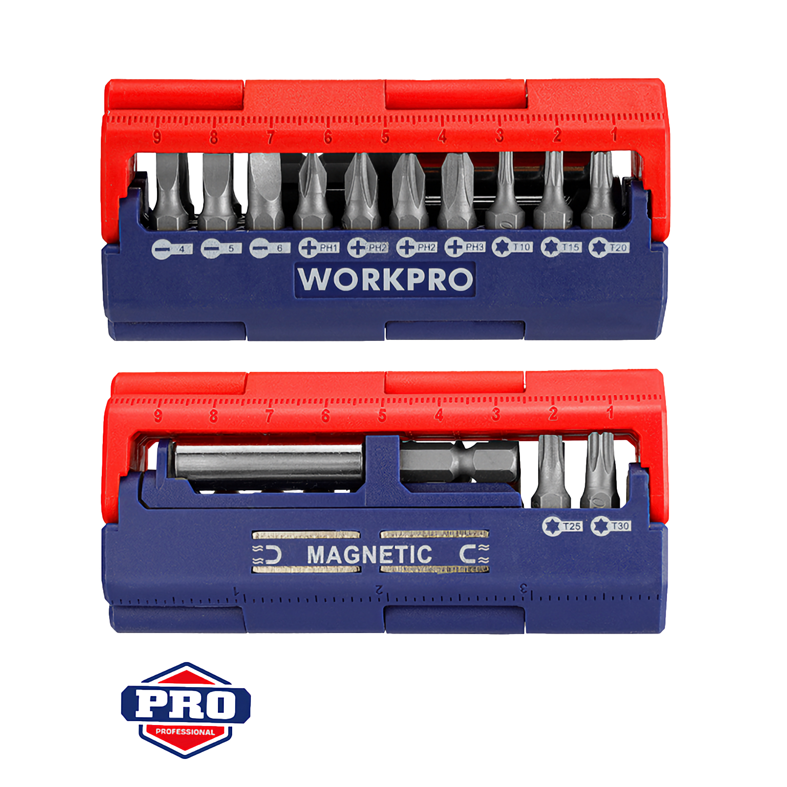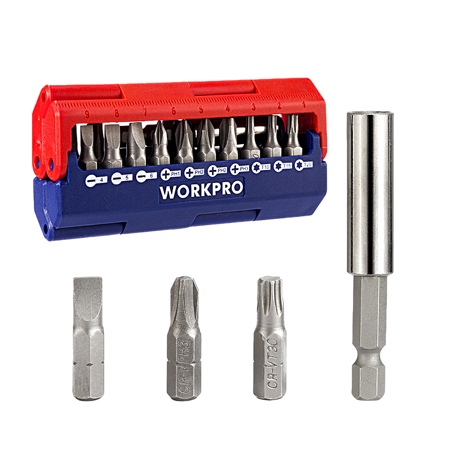 В наборе 12шт особо прочных бит 25мм: 4мм, 5мм, 6мм, PH1, PH2, PH2, PH3, T10, T15, T20, T25, T30.