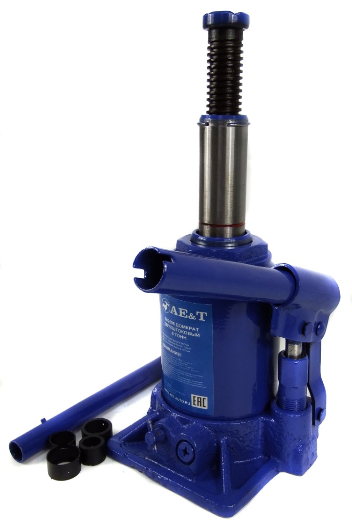 У домкратов с двухштоковой системой плунжеров есть ряд очевидных плюсов перед обычными: так как конструкция у них выдвижная, поднимают груз они на бóльшую высоту, при этом сохраняется небольшая высота подхвата. Т02006 отвечает требованиям как простого автолюбителя, так и профессионального специалиста, потому что способен вывесить любую легковую машину, лёгкий коммерческий транспорт – минивэны, фургоны, спецавтомобили, некоторые виды сельхозтехники.
