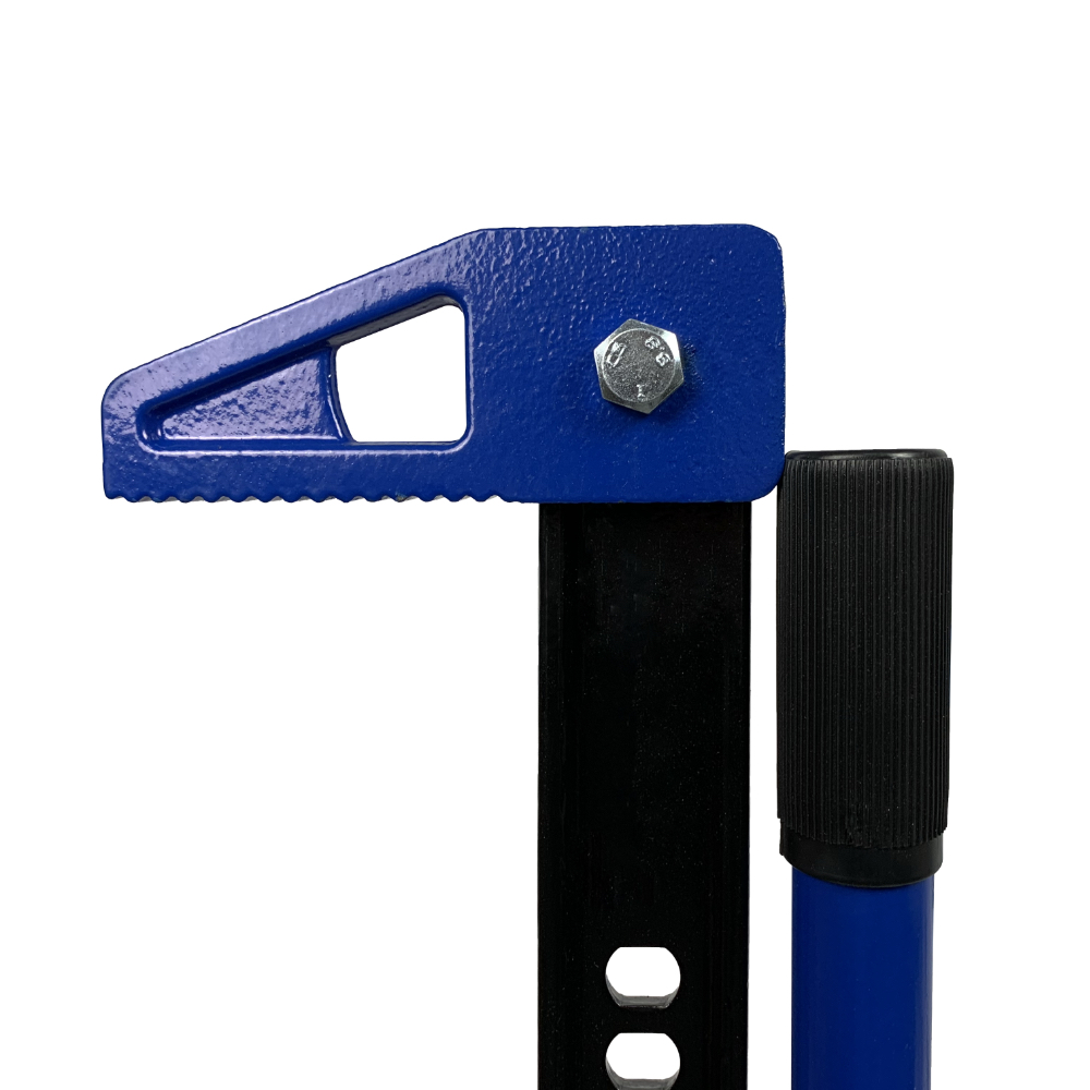 Прибор представляет собой рейку с грузодержателем на ней и ручкой. На ручке расположен переключатель направления движения: вверх или вниз. При равномерном нажиме на ручку поднимающий штырь переходит по отверстиям на рейке, и вы всегда можете зафиксировать его на необходимой высоте.