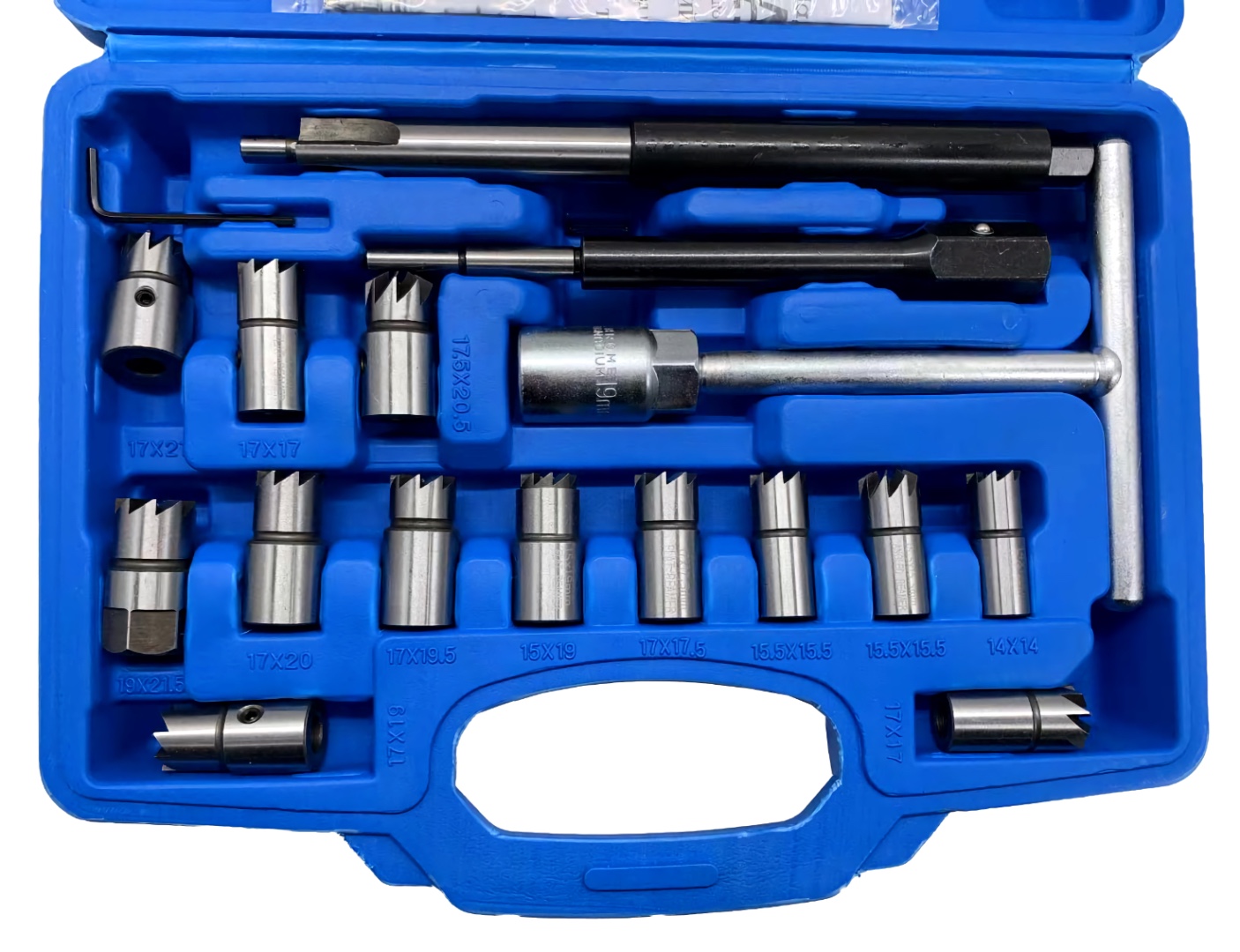 - Состав: угловые развертки 15.5 мм x 15.5 мм, 17 мм х 17 мм, 17 мм х 21 мм, плоские 14 мм x 14 мм, 15 мм x 15 мм, 15 мм х 19 мм, 17 мм x 17 мм, 17 мм x 17,5 мм, 17 мм х 19 мм, 17 мм x 19,5 мм, 17 мм х 20 мм, 17.5 мм x 20.5 мм, 19 мм х 21.5 мм, Т-образная рукоять под 19 мм 160 мм (длина) х135 мм (вороток), адаптер 180 мм, привод 19 мм, резак 15.5 мм x 225 мм, шестигранный ключ 2.5 мм