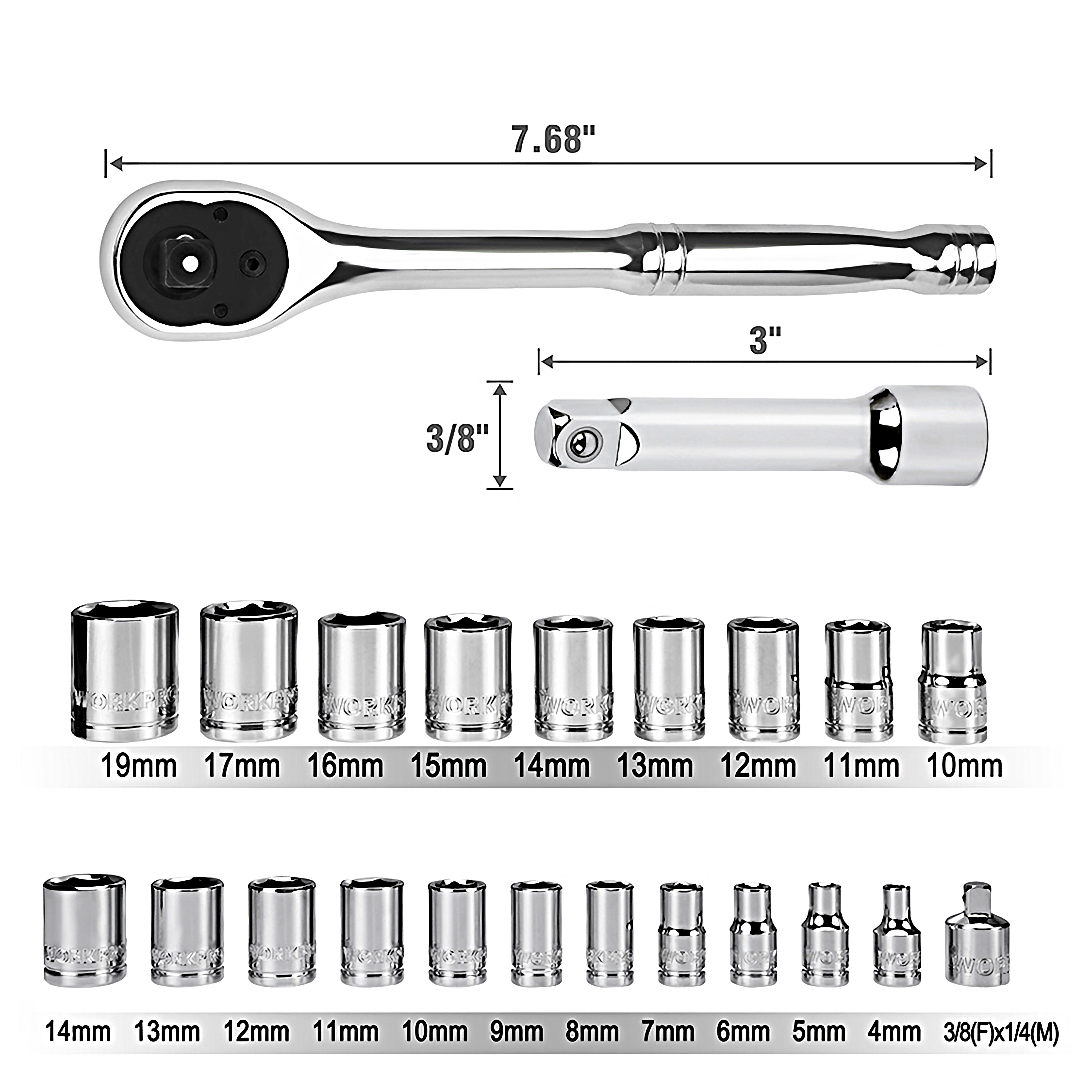 • хром-ванадиевые головки 3/8" 9шт: 10, 11, 12, 13, 14, 15, 16, 17, 19мм
