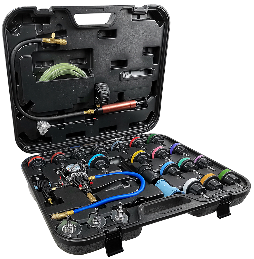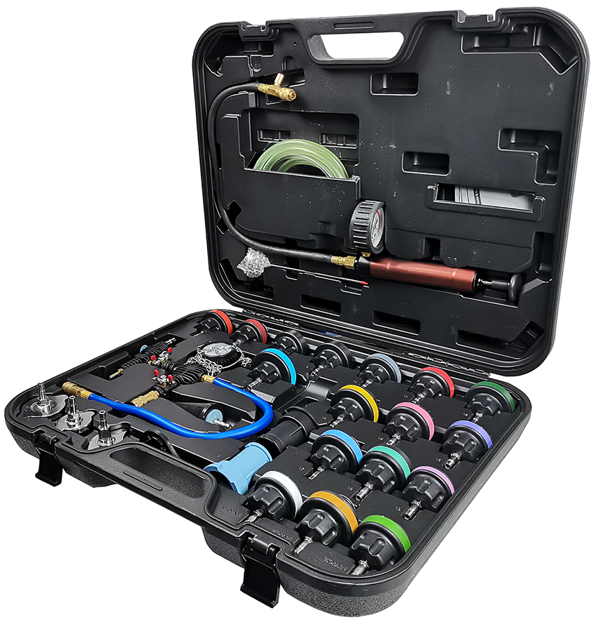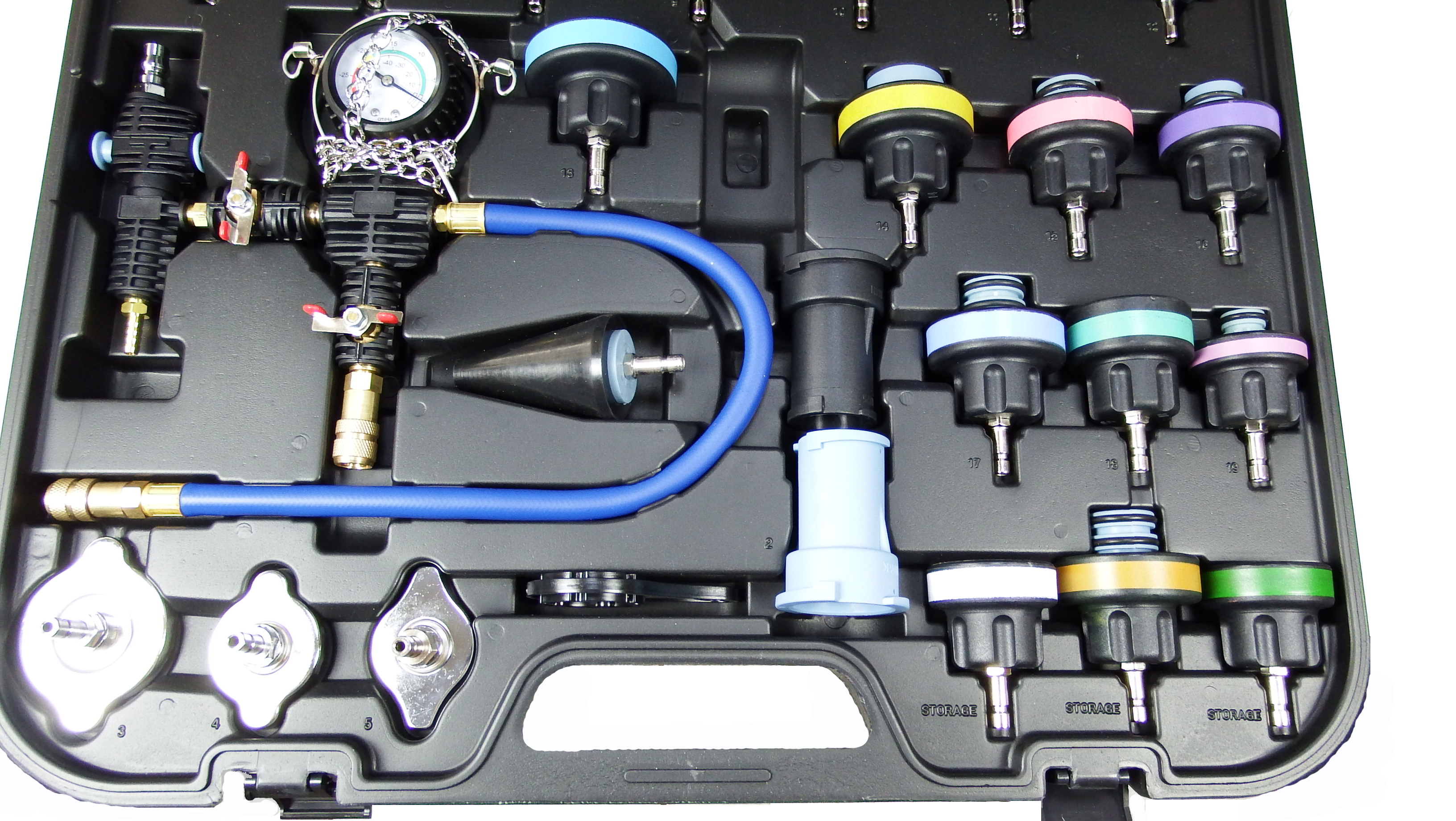 Опрессовка TA-G1025 пригодится мастеру-профессионалу при диагностике и ремонте системы охлаждения. В наборе множество адаптеров под практически все существующие стандарты соединений — 14 шт, а также насос с манометром.