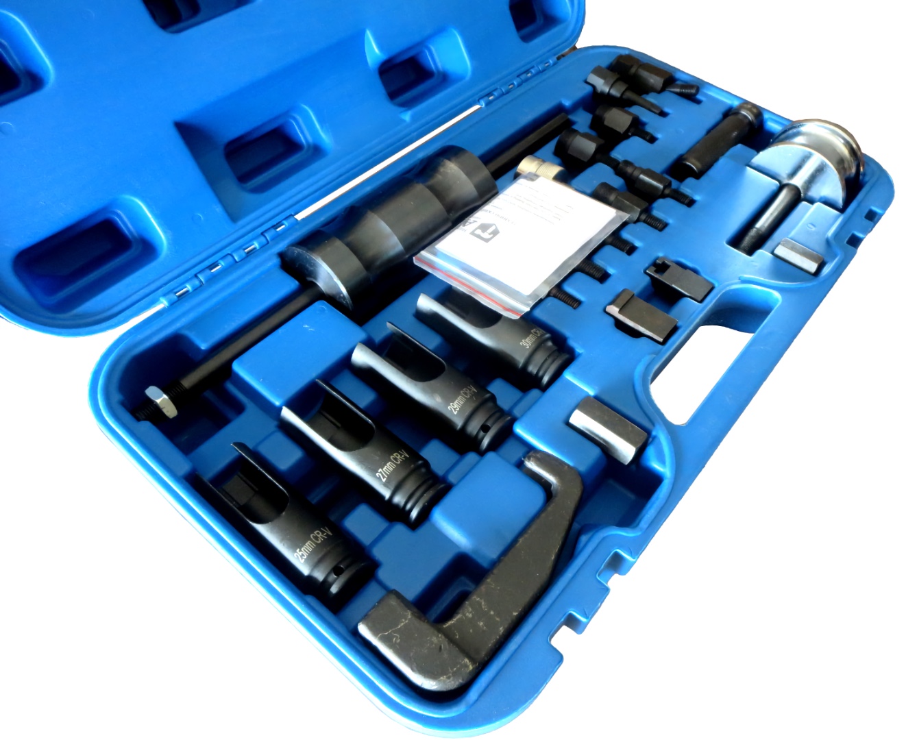 Съемник инжекторов дизелей TA-D1118-A можно использовать для демонтажа техники Bosch, Delphi, Denso, Siemens и Pumpe Duse. Большой комплект из ключей, обратных молотков и переходников позволяет работать, не повреждая агрегаты.
