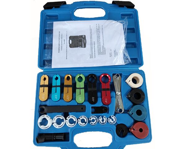 Съемники TA-A1039 предназначены для проведения работ с топливными линиями и автомобильными кондиционерами. Комплект из двадцати двух предметов, совместимых с подавляющим большинством систем отечественных машин и иномарок.