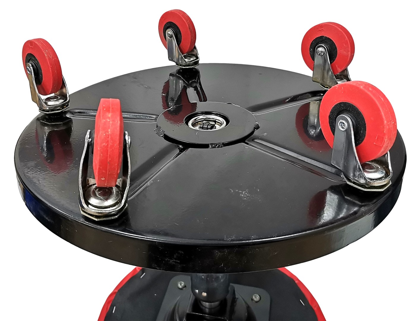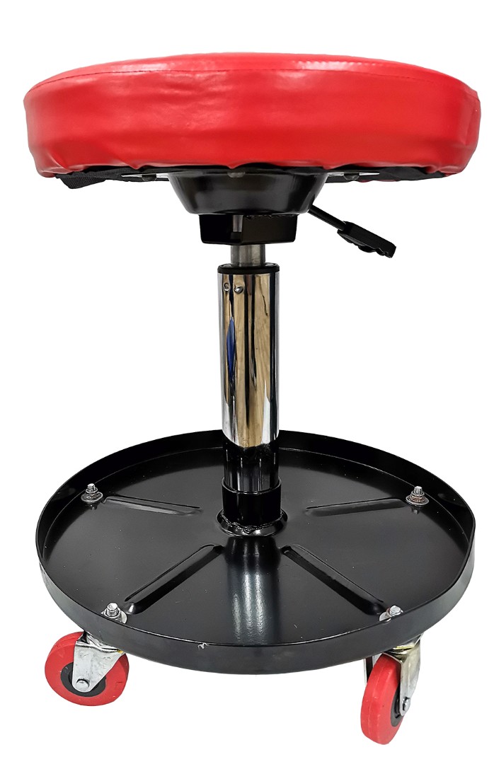 Сидушка из плотного поролона с отделкой из эко-кожи имеет круглую форму, при помощи рычага можно отрегулировать высоту сиденья, установив его в удобное положение. В нижней части размещен эргономичный лоток для всех инструментов, которые должны быть под рукой в рабочем процессе. Поворотные колеса обеспечивают легкую маневренность.