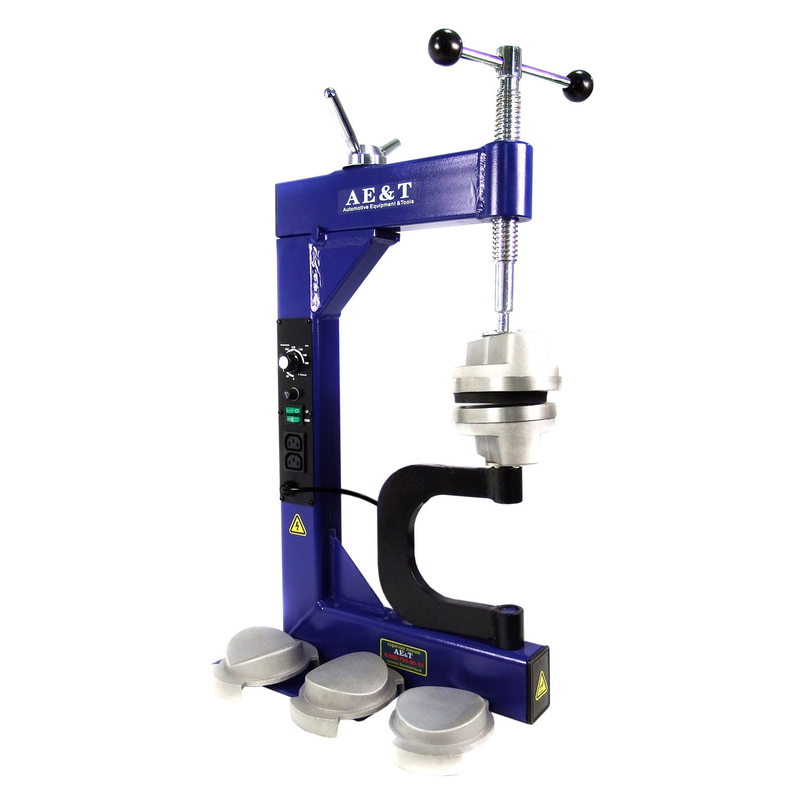 Прибор оснащен ручным винтовым прижимом для фиксации покрышки и регулятором температуры вулканизации.
