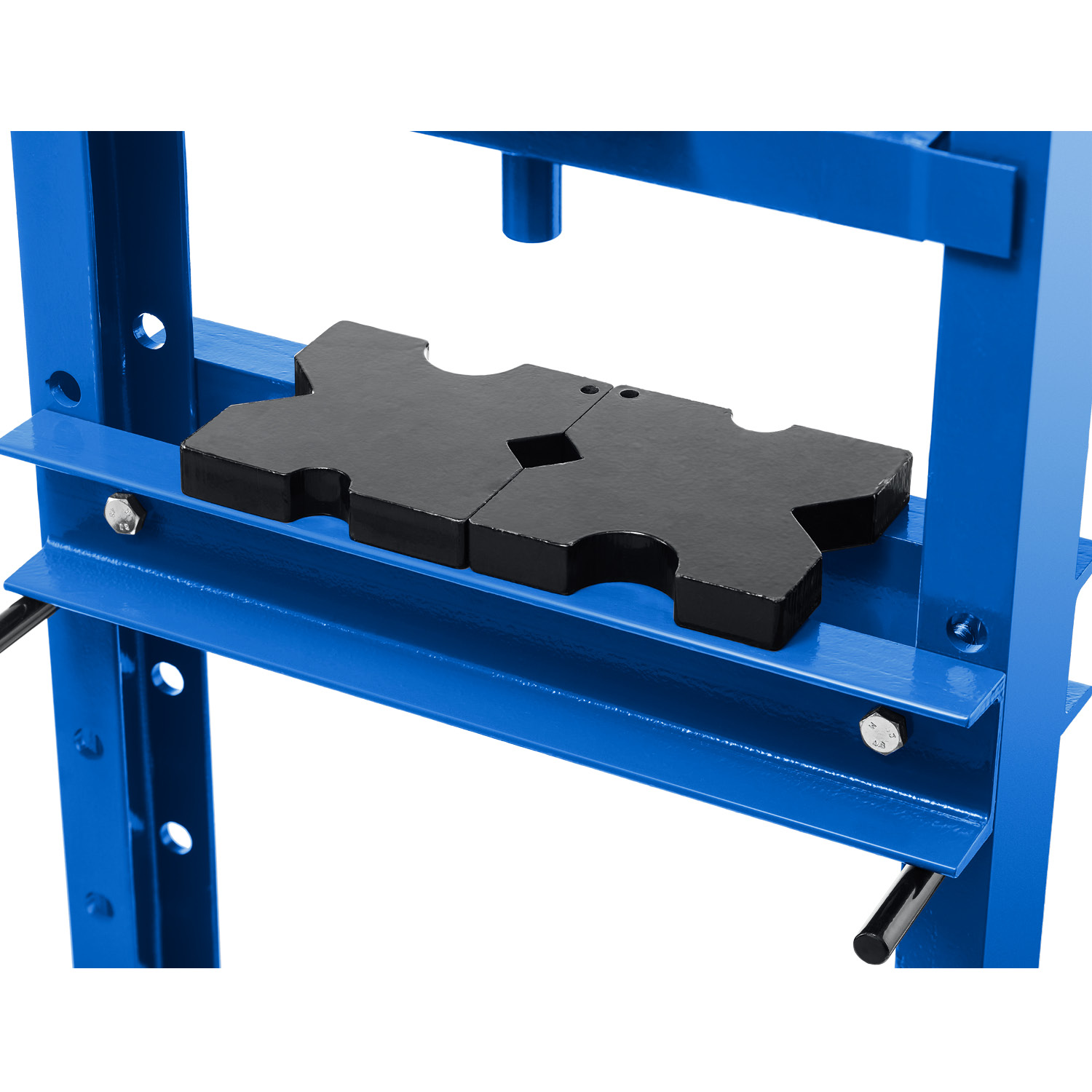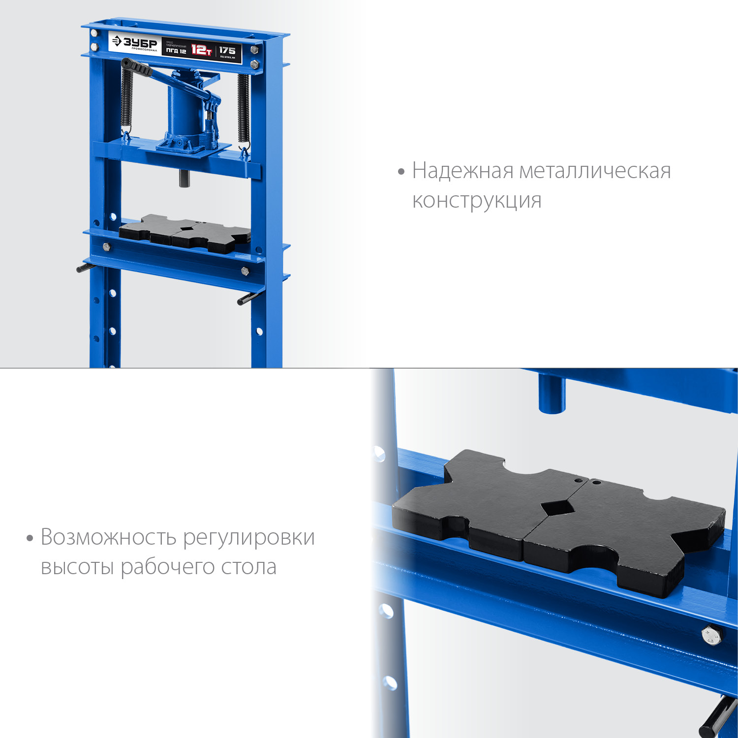 Пресс ЗУБР - мощный инструмент для запрессовки деталей. Отличается прочной металлической конструкцией. Широкое Н-образное основание надежно крепится к полу анкерными болтами. Силовым элементом пресса является домкрат, который при работе опускает подъемную платформу и запрессовывает деталь
