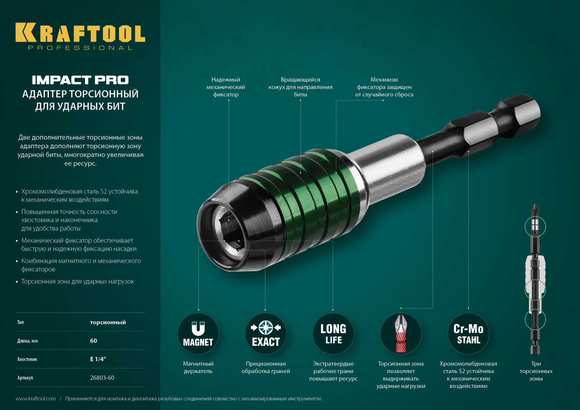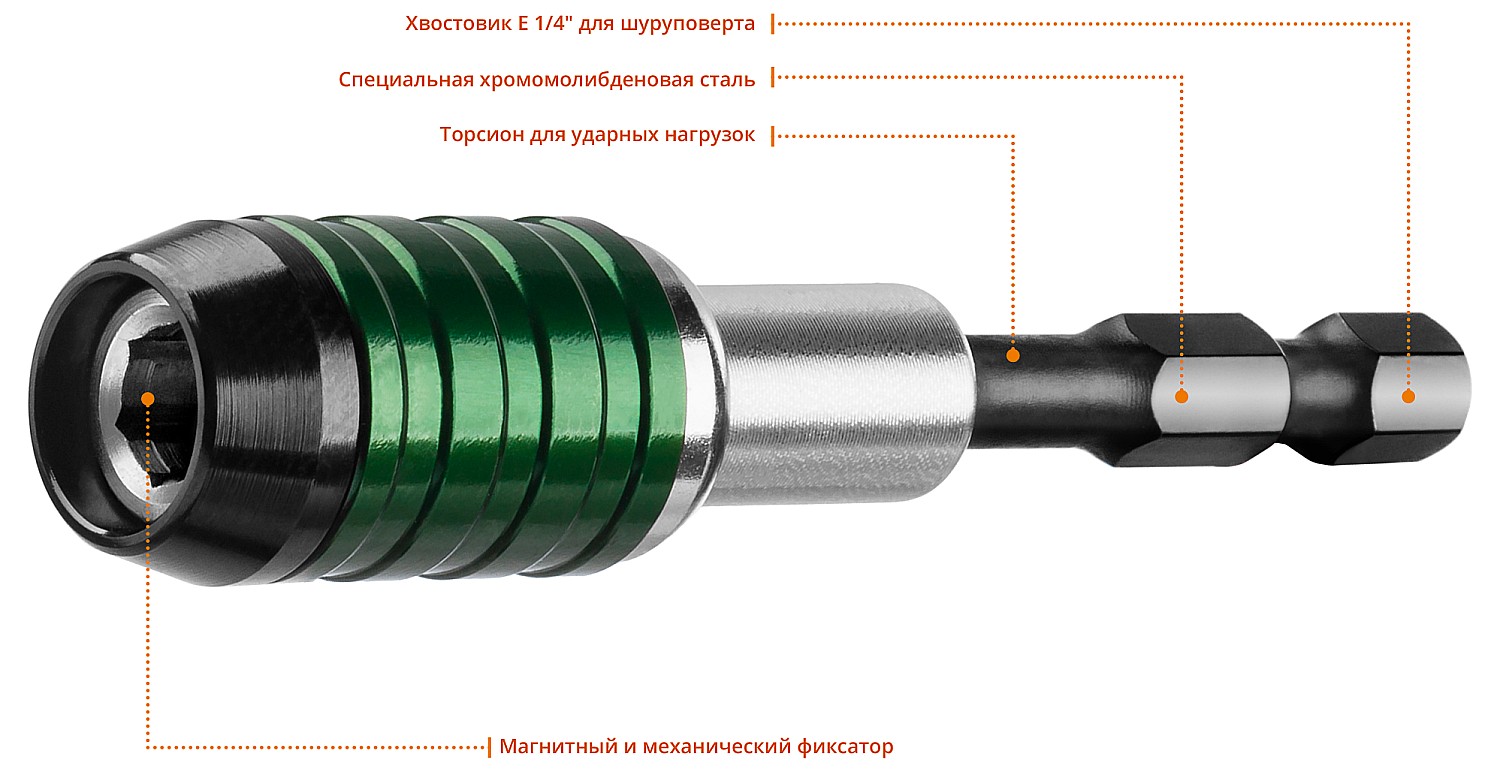 Профессиональный адаптер KRAFTOOL Impact Pro для ударных шуруповертов. Разработан в соответствии с высокими требованиями, обеспечивают высокую надежность. Эластичный стержень предохраняет наконечник от разрушения при пиковых нагрузках.