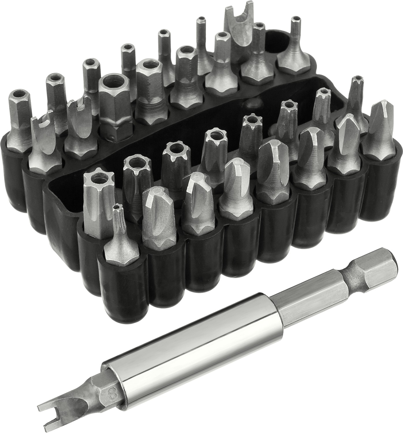 Профессиональные биты для ручного и механизированного инструмента изготовлены из высококачественной стали и имеют точную геометрию шлицов, что обеспечивает длительный срок службы. В комплект входит магнитный адаптер.