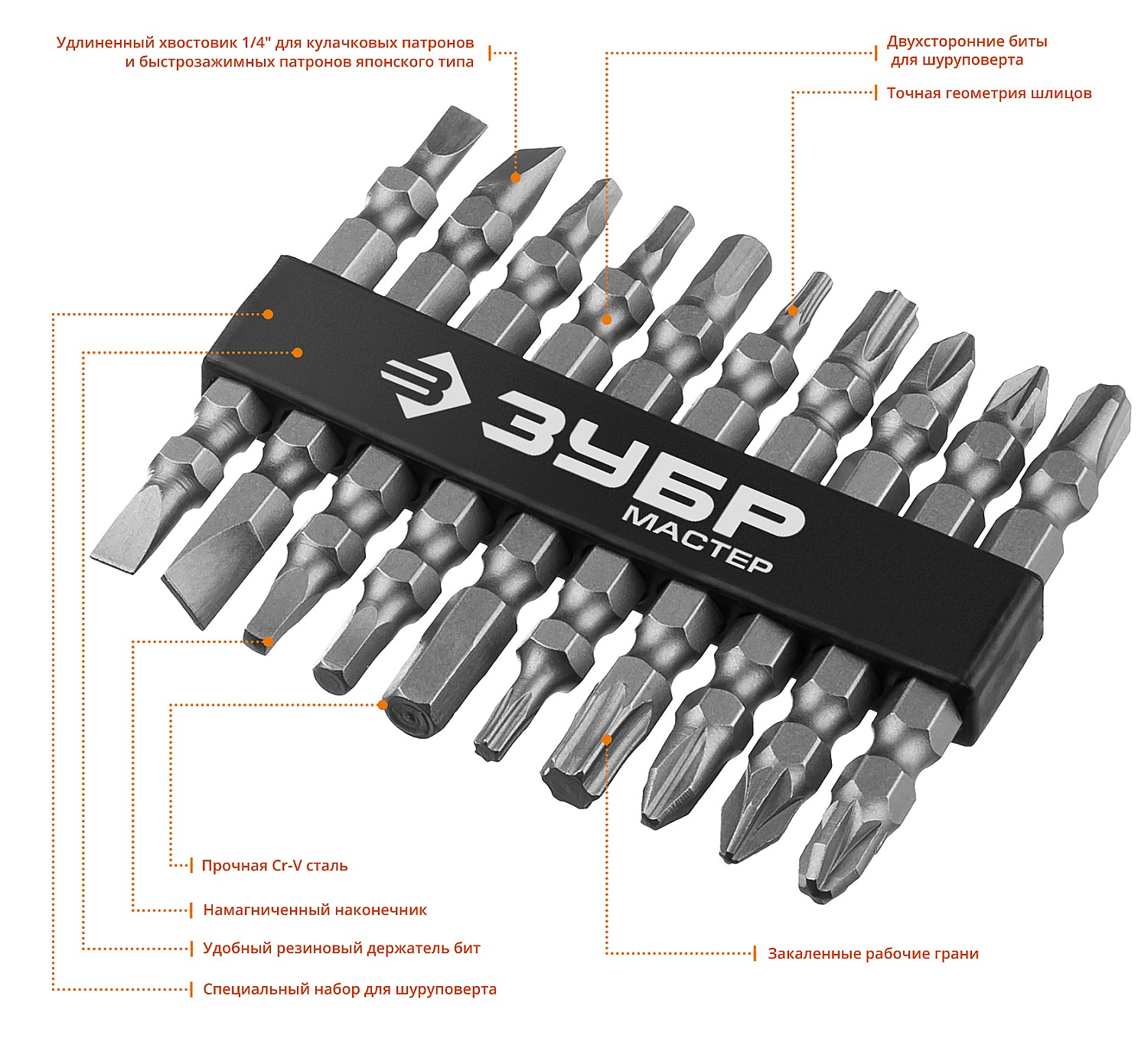 Профессиональные биты ЗУБР для ручного и механизированного инструмента изготовлены из высококачественной стали и имеют точную геометрию шлицов, что обеспечивает длительный срок службы.