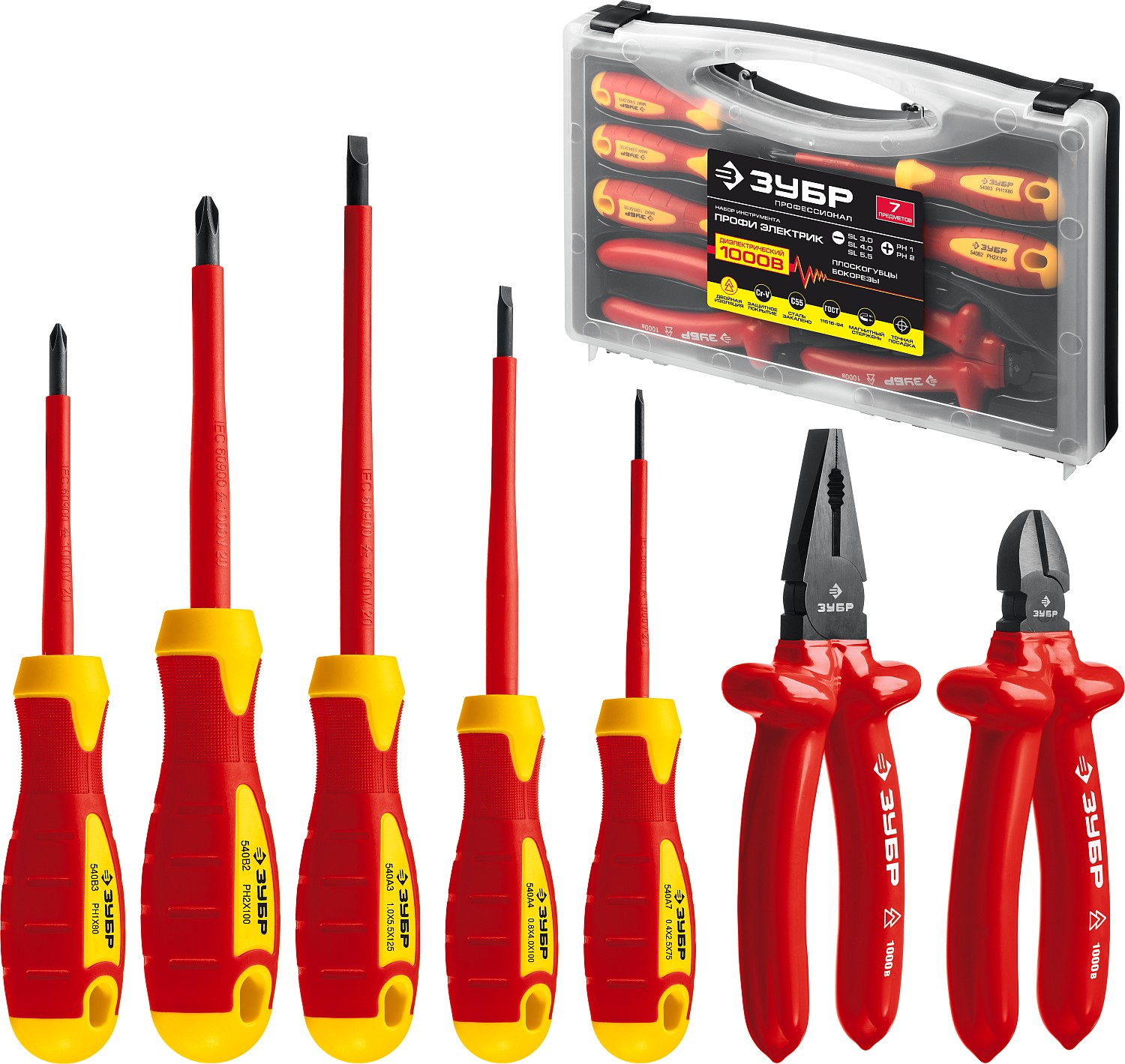 Профессиональный набор инструментов включает в себя наиболее необходимые инструменты, предназначеные для работ под напряжением до 1000 В и захвата и удерживания мелких предметов, перекусывания проволоки средней твердости и других слесарных и монтажных работах.