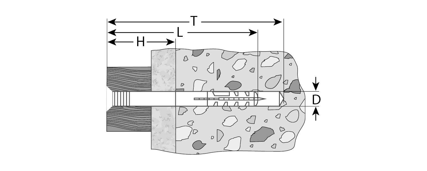 Для быстрого сквозного монтажа различных конструкций к полнотелым основаниям (бетон, кирпич, природный камень). Установка производится в предварительно просверленное и очищенное от буровой муки отверстие диаметром 8мм.
