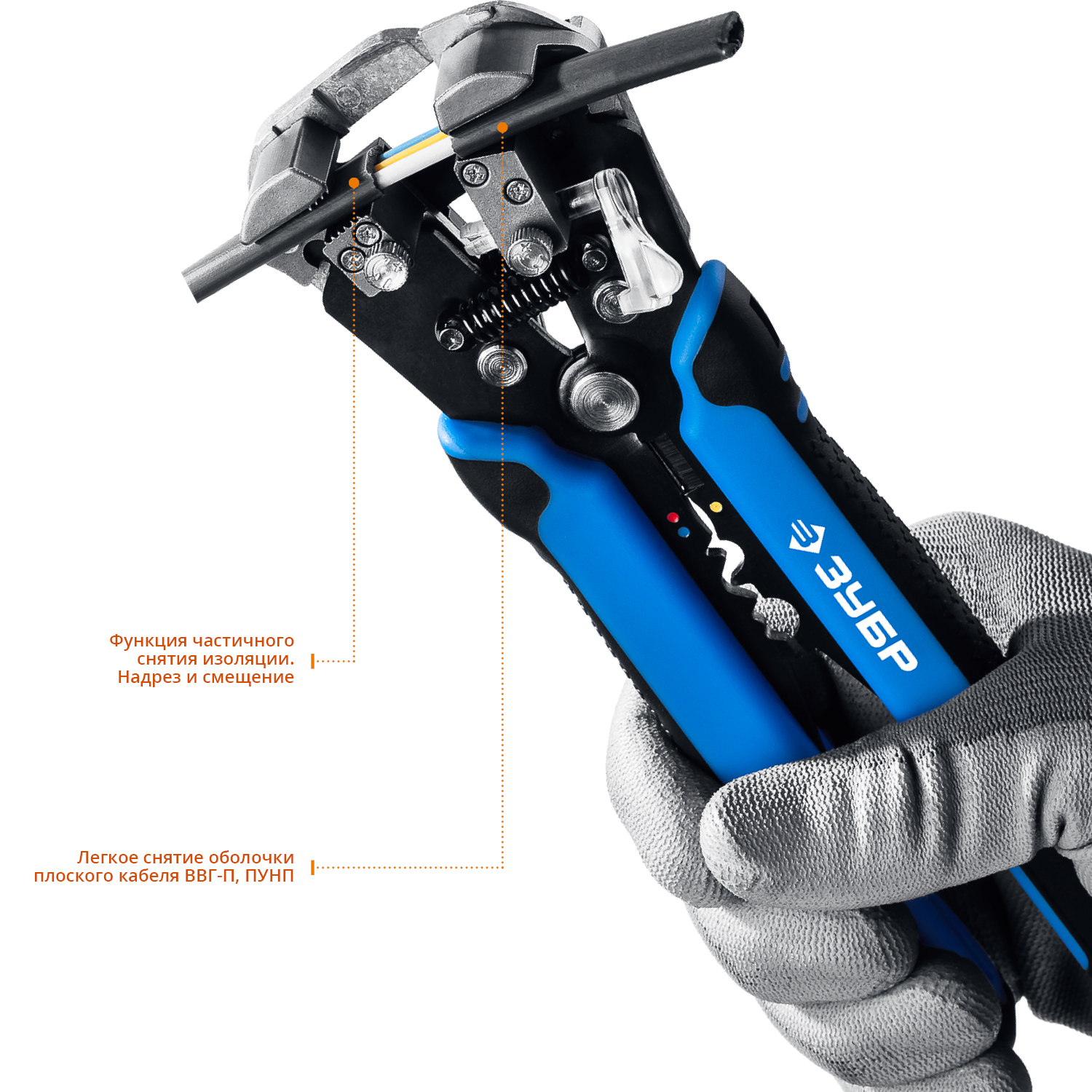 для снятия изоляции и оболочки кабеля. Отличный выбор для разделки кабеля в больших количествах. Не нужно подбирать гнездо под сечение – губки подстраиваются под размер, а изоляция снимается автоматически. Можно снимать внешнюю оболочку не только с круглого, но и с плоского провода