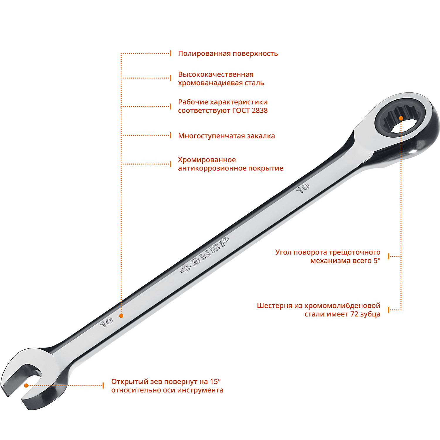 ЗУБР 10 мм, Комбинированный трещоточный гаечный ключ, Профессионал (27074-10)