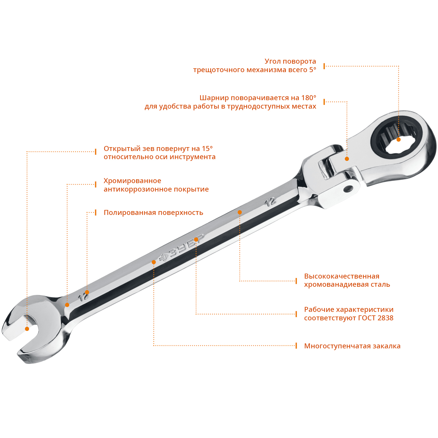 ЗУБР 12 мм, Шарнирный трещоточный гаечный ключ, Профессионал (27101-12)
