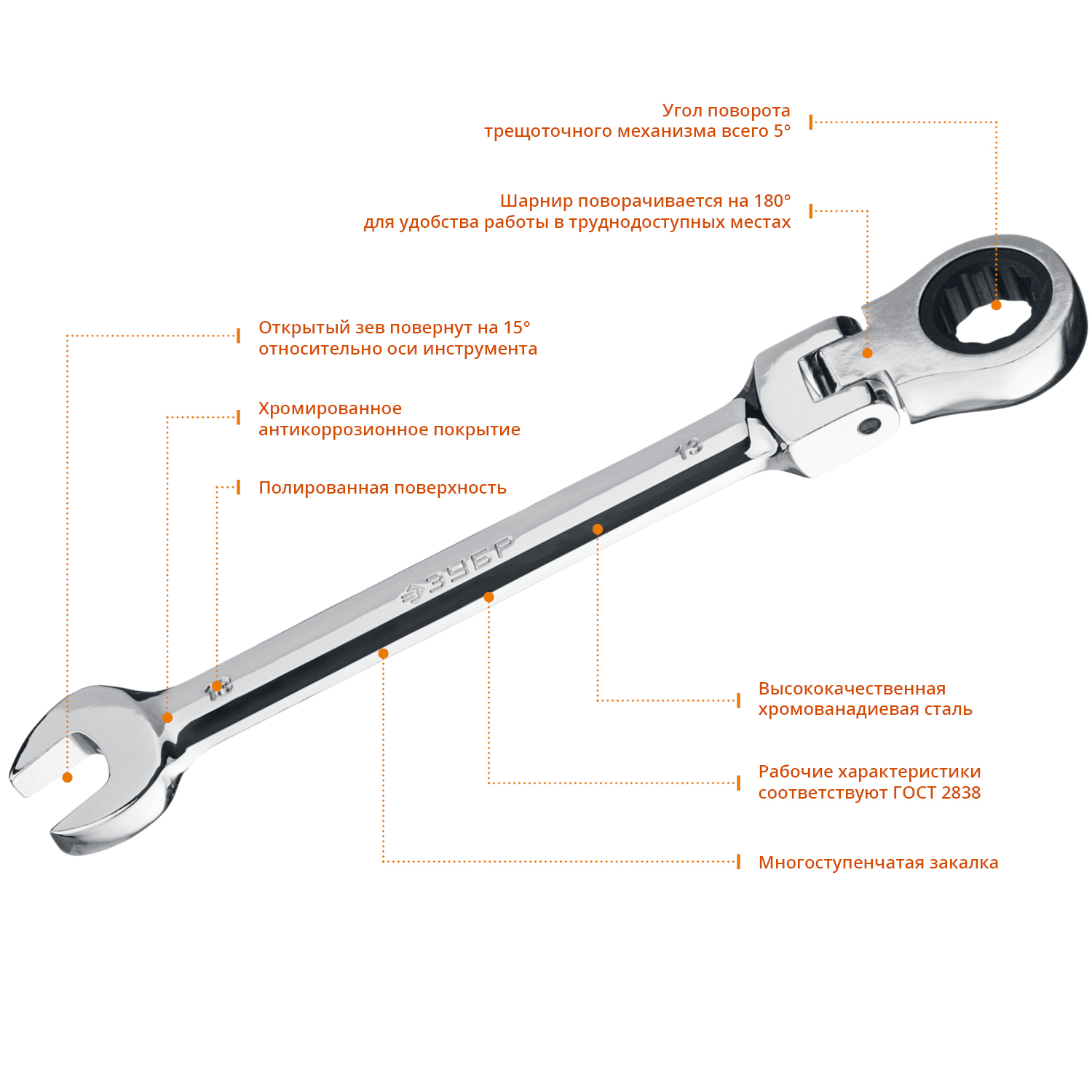 ЗУБР 13 мм, Шарнирный трещоточный гаечный ключ, Профессионал (27101-13)