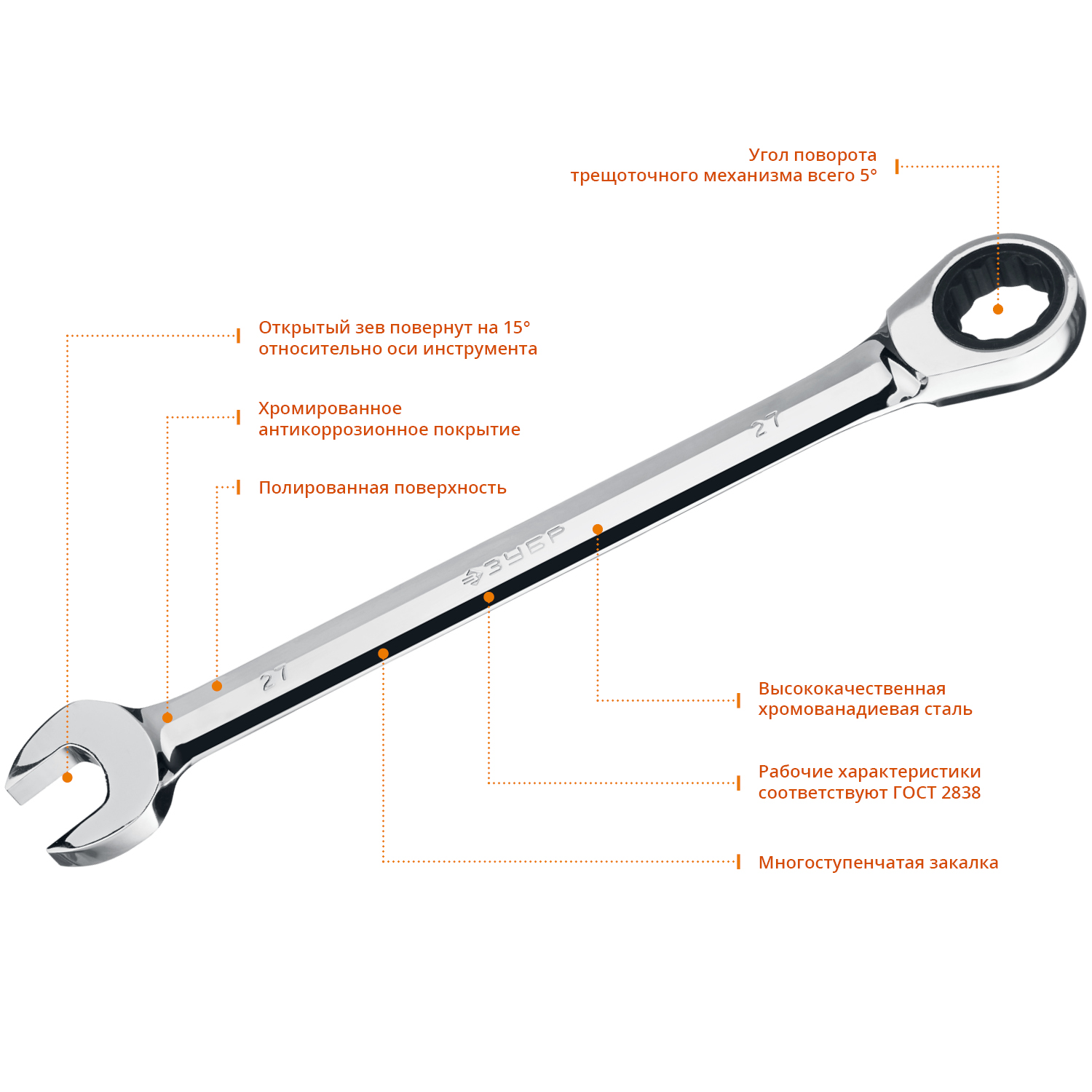ЗУБР 27 мм, Комбинированный трещоточный гаечный ключ, Профессионал (27074-27)