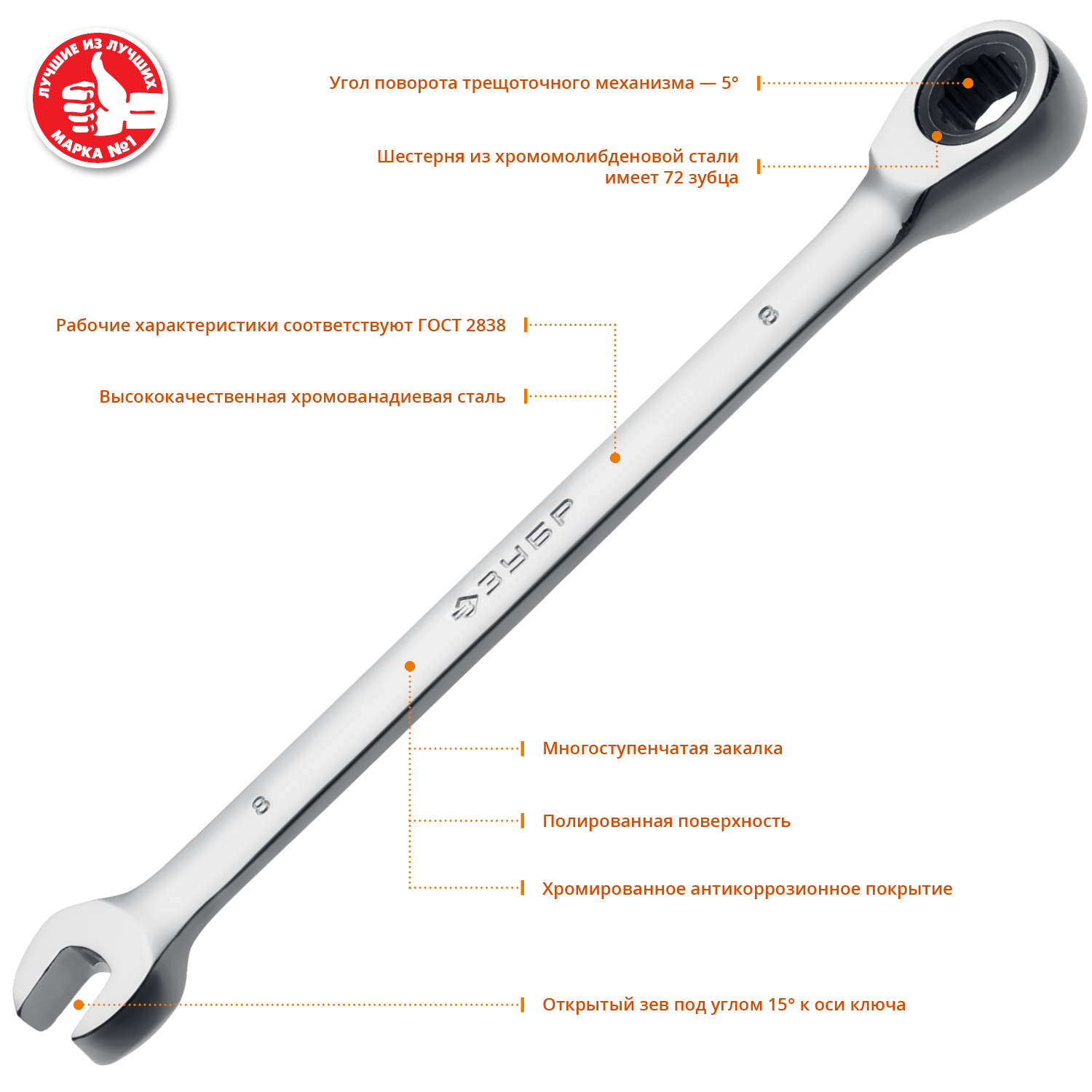 ЗУБР 8 мм, Комбинированный трещоточный гаечный ключ, Профессионал (27074-08)