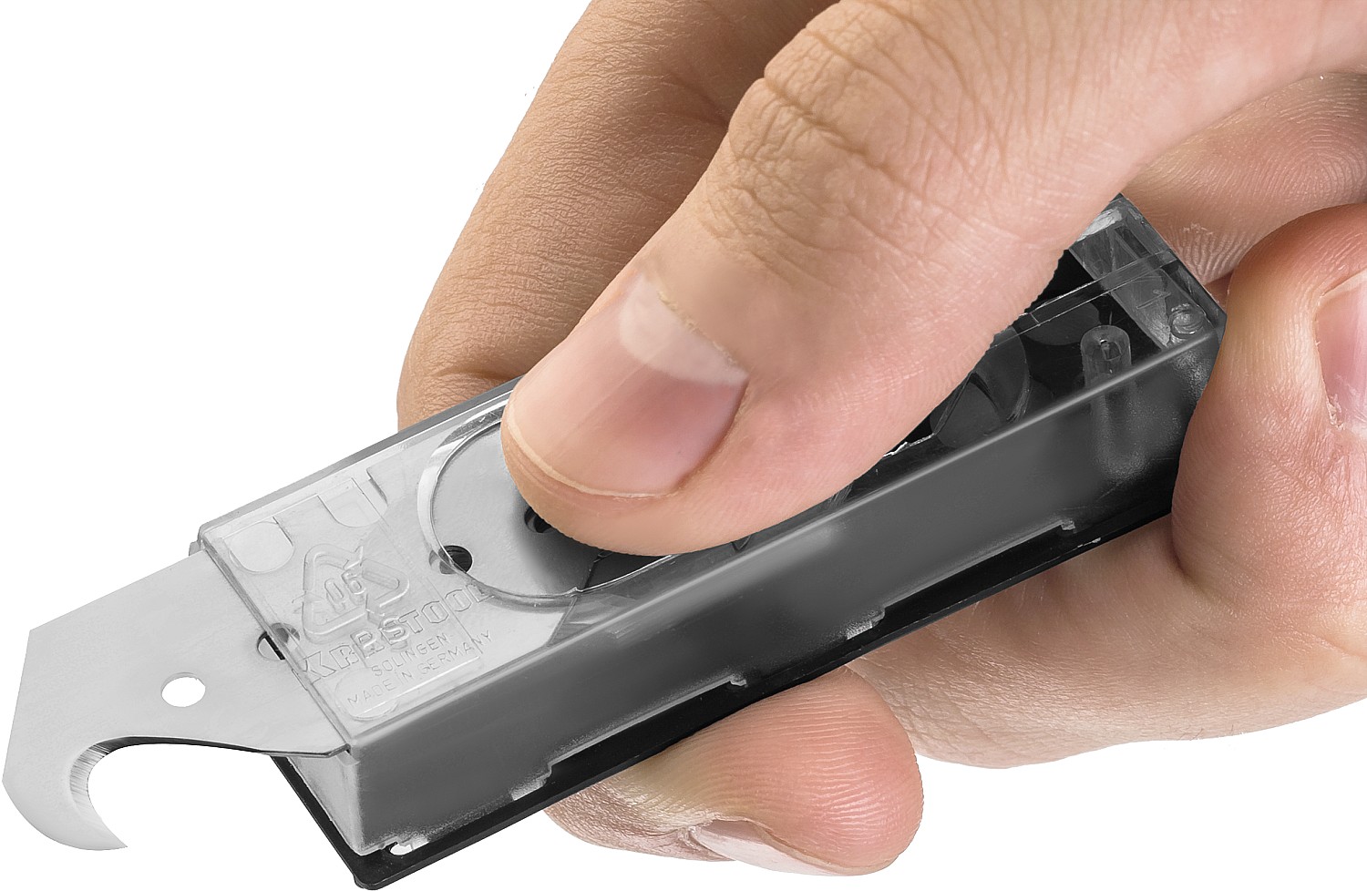 • Крюковидная форма лезвия позволяет выполнять рез, не повреждая поверхность под материалом