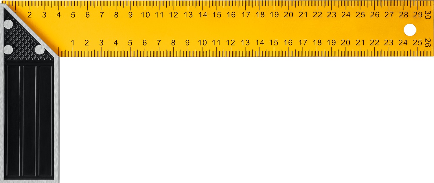 Столярный угольник имеет двустороннюю разметку, что значительно облегчает работу. Имеет отверстие, которое позволяет хранить его в подвешенном состоянии и шлифованное основание для удобства работы.