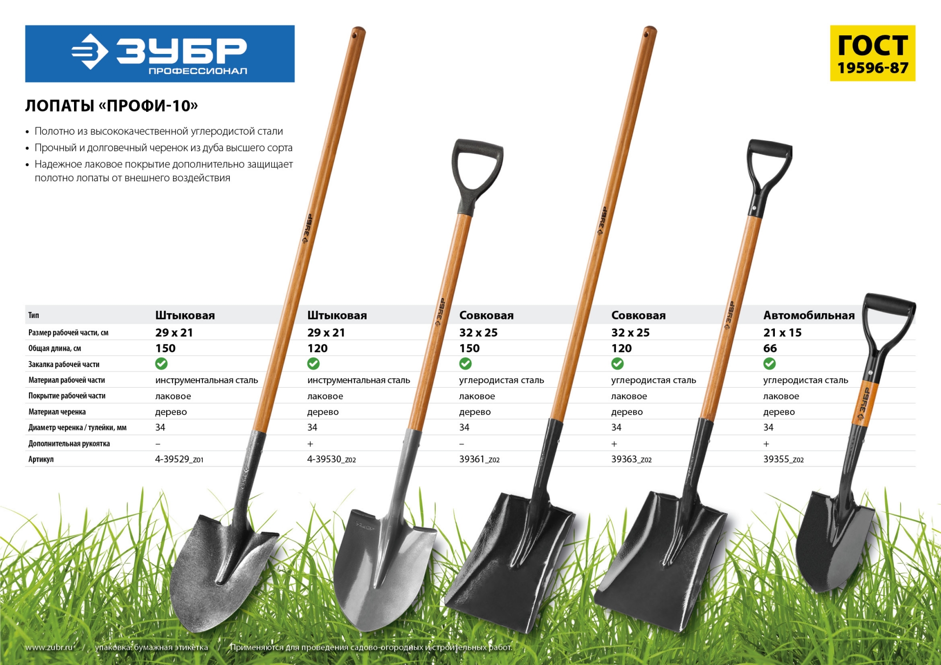 ЗУБР Профи-10, 290х210х1500мм, полотно 1.7мм, закалено, черенок из дуба высш. сорта, штыковая лопата, тип ЛСГ, ПРОФЕССИОНАЛ (4-39529)