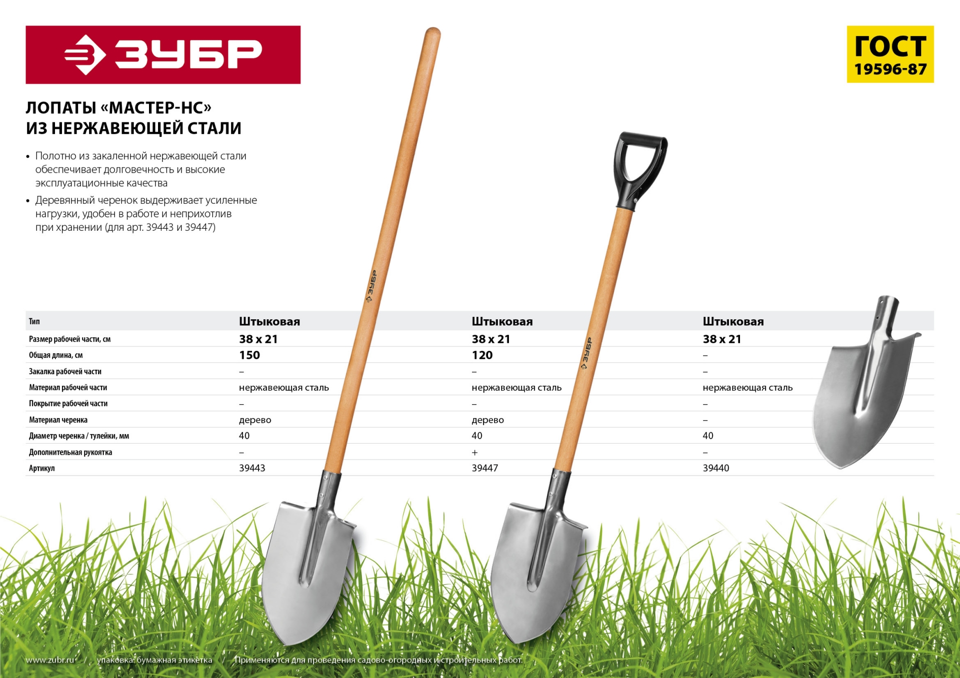 ЗУБР Мастер-НС, 380х208х1200мм, полотно 2мм, нержавеющая сталь, закалено, дерев.лакир.черенок высш.сорт с рукояткой, штыковая лопата, тип ЛКО (39443)