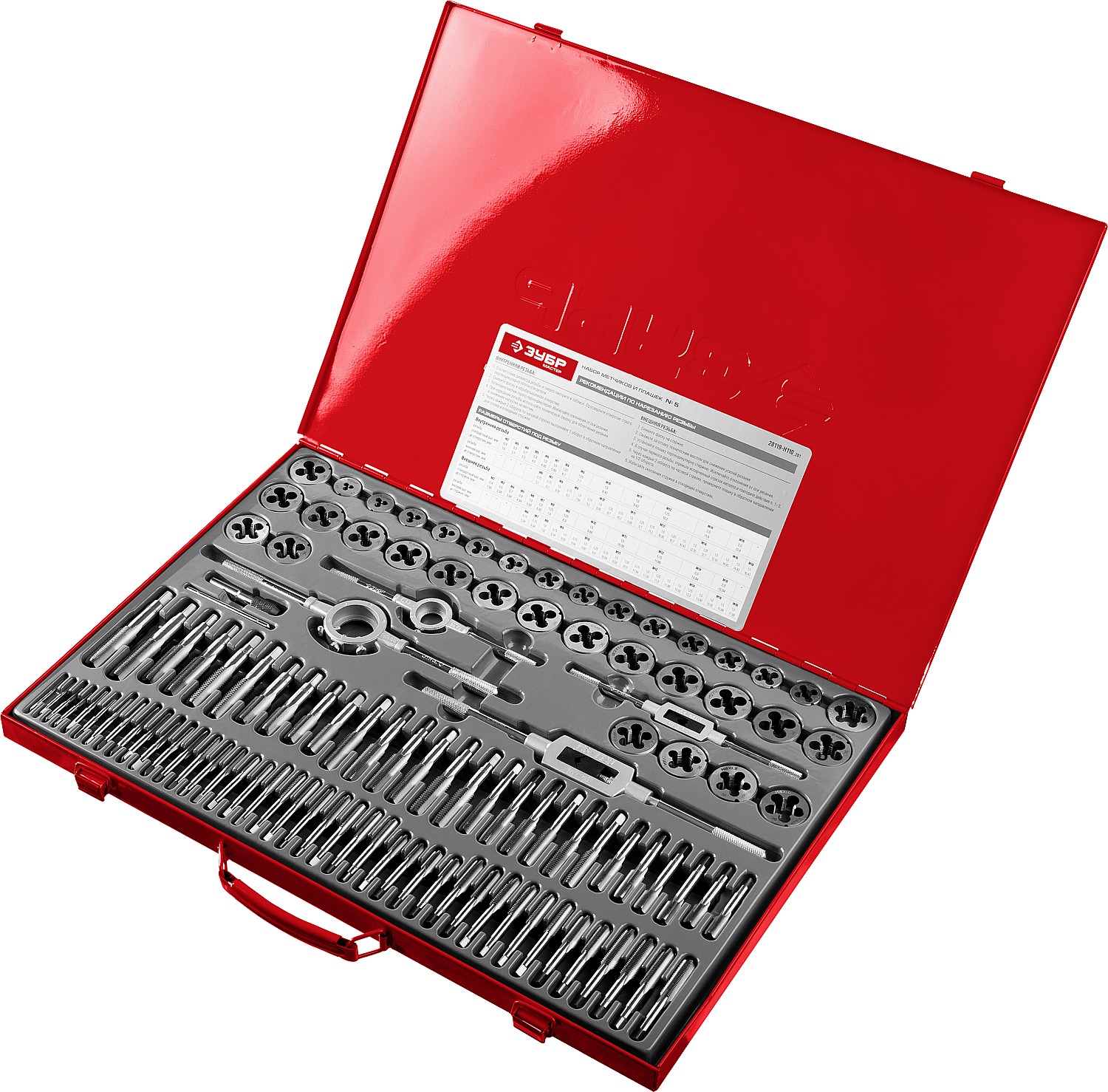 ЗУБР 110 предм., сталь 9ХС, Набор метчиков и плашек (28119-H110)