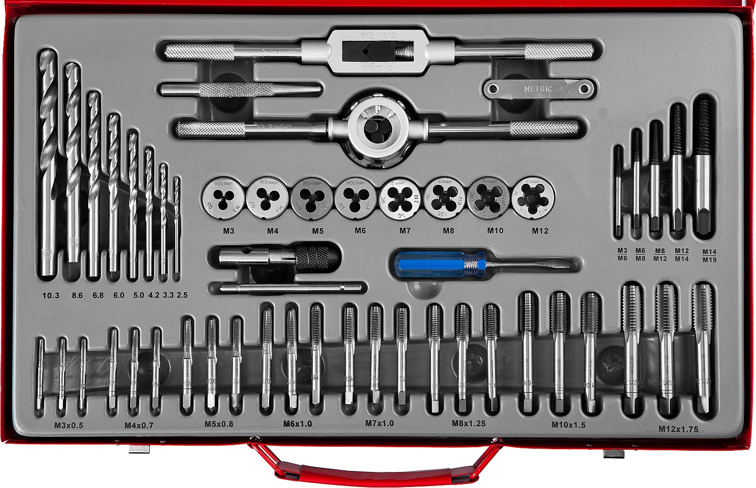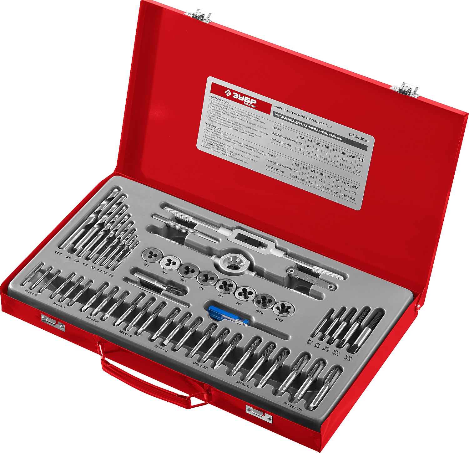 ЗУБР 52 предм., сталь 9ХС, Набор метчиков и плашек (28130-H52)