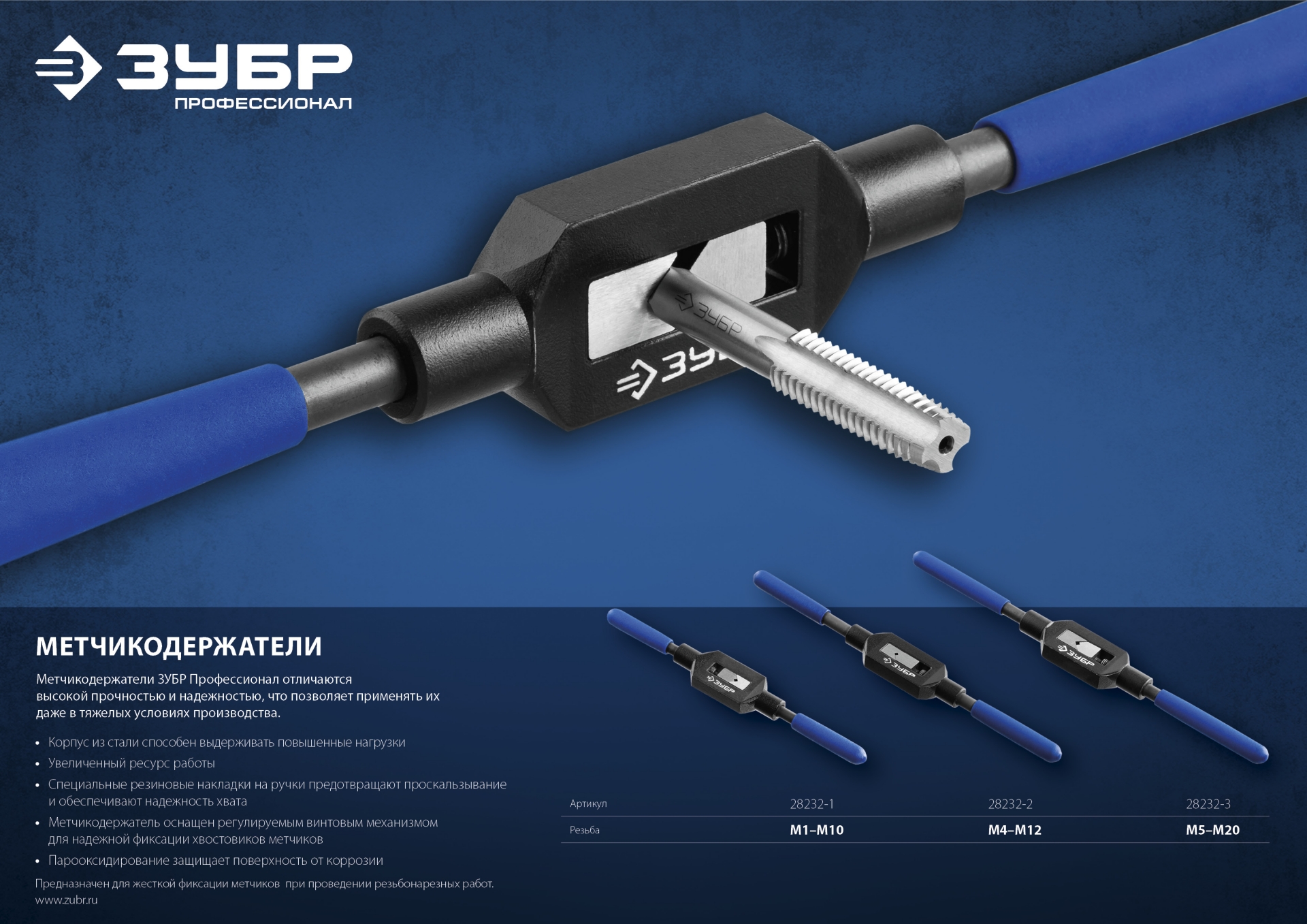 Метчикодержатели ЗУБР ПРОФЕССИОНАЛ отличаются высокой прочностью, что позволяет применять их даже в тяжелых условиях производства