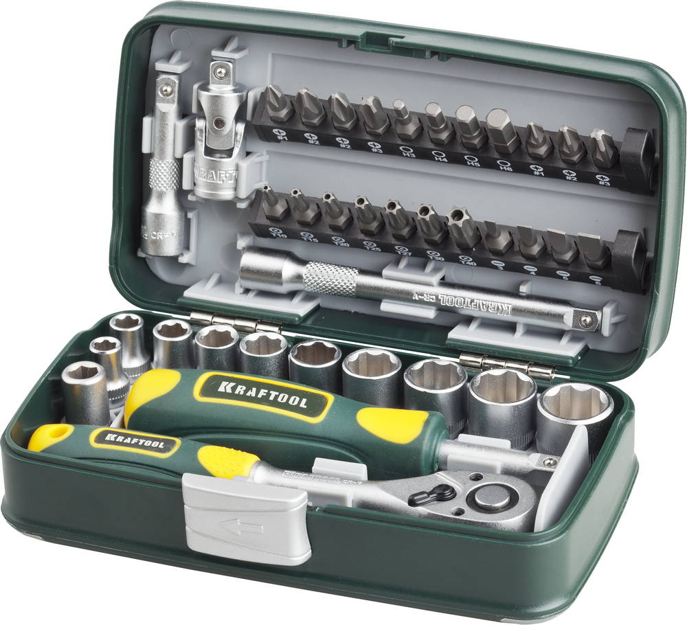 Профессиональный компактный набор слесарно-монтажного инструмента KRAFTOOL изготовлен из высококачественной хромованадиевой стали. Биты и торцовые головки отличаются тщательно закаленными рабочими поверхностями, что обеспечивает высокое качество выполнения работ и длительный срок службы. Используются с ручным и механизированным инструментом.