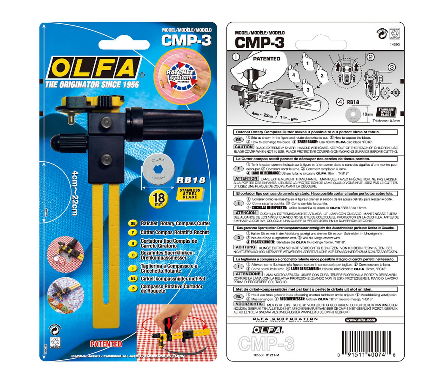 Отличное соотношение цены и качества: поставляется с 18-миллиметровым круговым лезвием из нержавеющей стали OLFA, которое позволяет вырезать идеальные круги диаметром от 40 до 220 мм из различных тканей и бумаги.