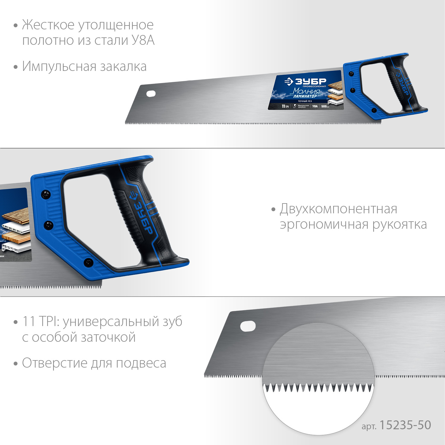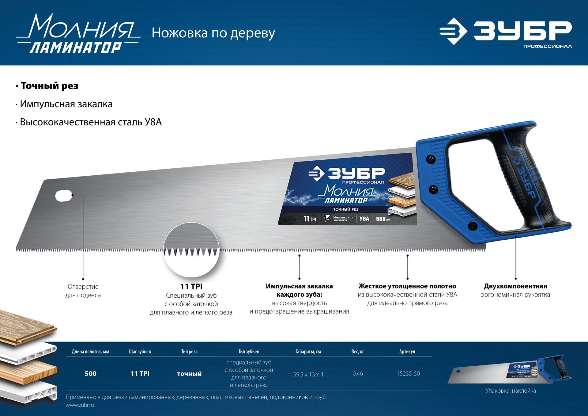 Надежная конструкция с трехгранными закаленными зубьями, остро заточенными с трех сторон, обеспечивает точный рез ламината, деревянных, пластиковых панелей, подоконников и труб.