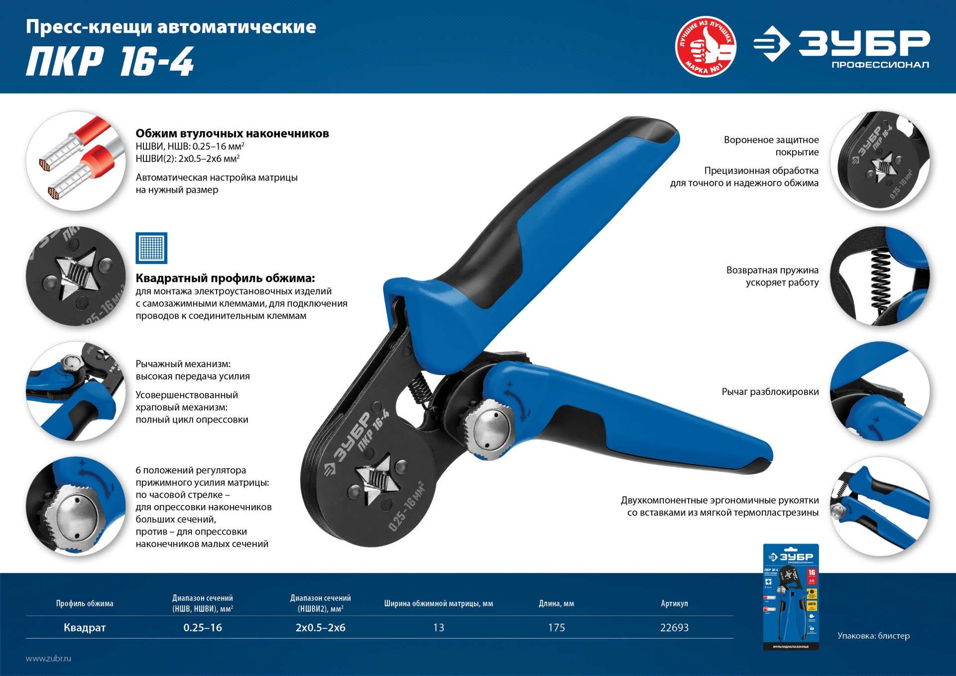 - Усовершенствованный храповый механизм, гарантирующий полный цикл прессовки