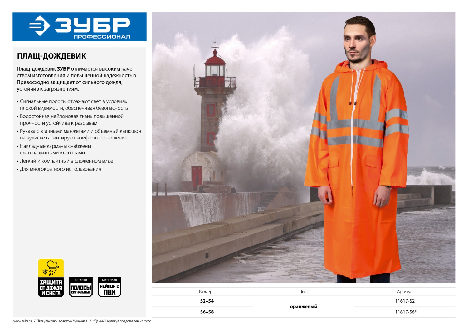 Плащ-дождевик ЗУБР отличается высоким качеством изготовления и повышенной надежностью. Превосходно защищает от сильного дождя, устойчив к загрязнениям и разрывам.