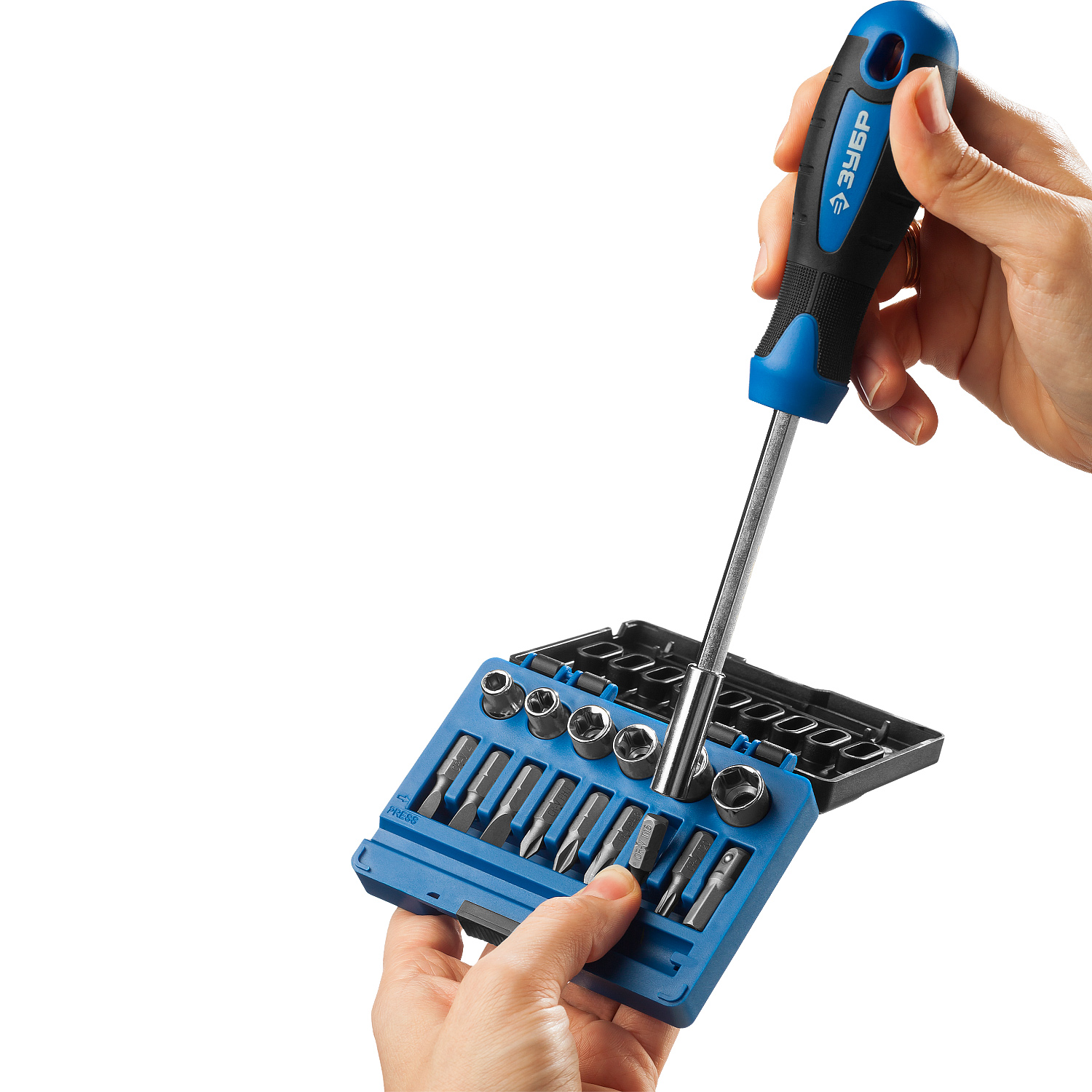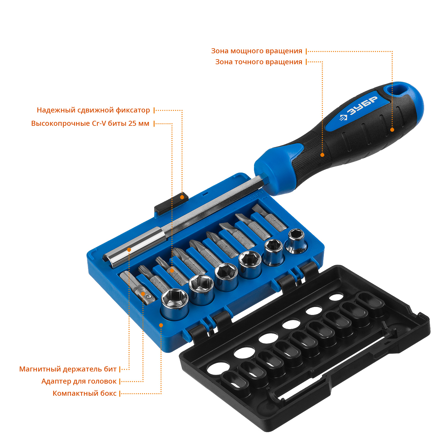 Компактная универсальная отвертка-битодержатель с набором бит и головок. Выдерживают высокие нагрузки благодаря высококачественной хромомолибденовой стали, закаленной по особой технологии.