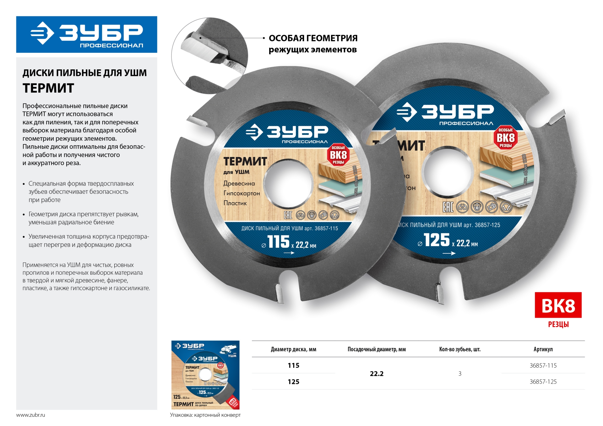 • Геометрия диска разработана для уменьшения радиального биения и препятствует отскоку инструмента при работе