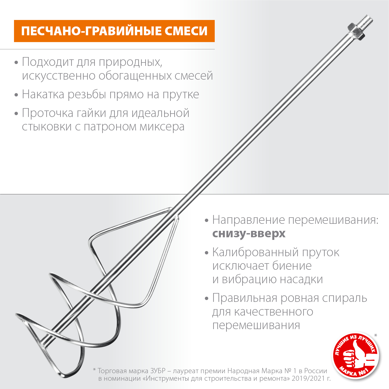 Насадка с лопастями для перемешивания песчано-гравийных смесей. Используется совместно с ручными миксерами ЗУБР ЗМР-1200Э-1, МР-1050-1, МР-1100, МР-1400-2 и МР-1600-2. Сделано в России