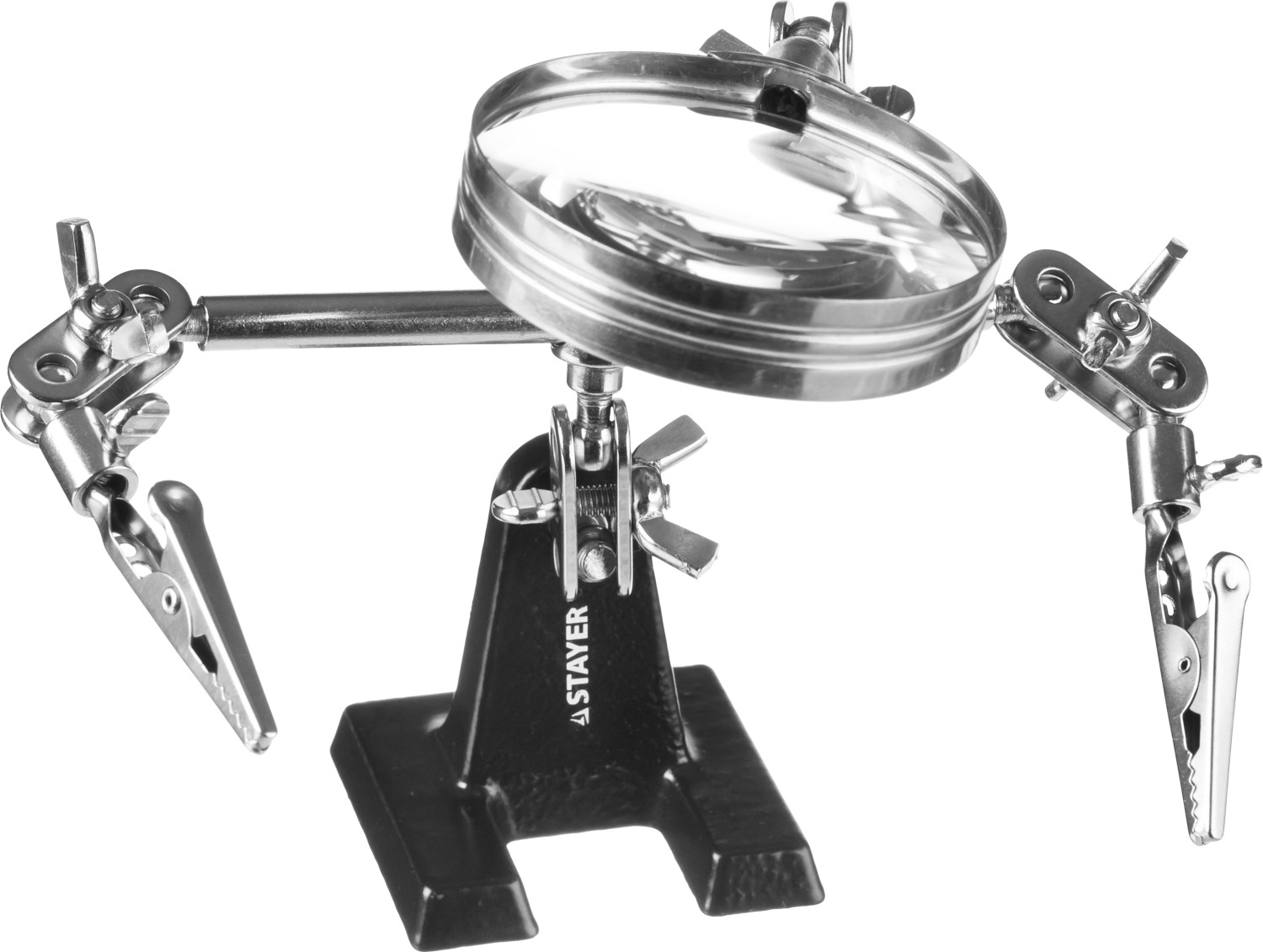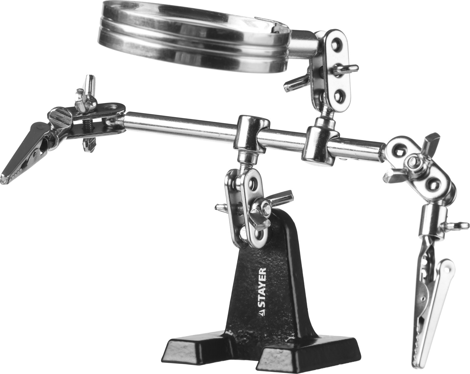 Штатив освобождает руки и позволяет легко осуществлять паяльные работы на электронной плате при помощи зажимов для крепления и поворотного механизма и качественной линзы. Необходимой при пайке элементов малого размера.