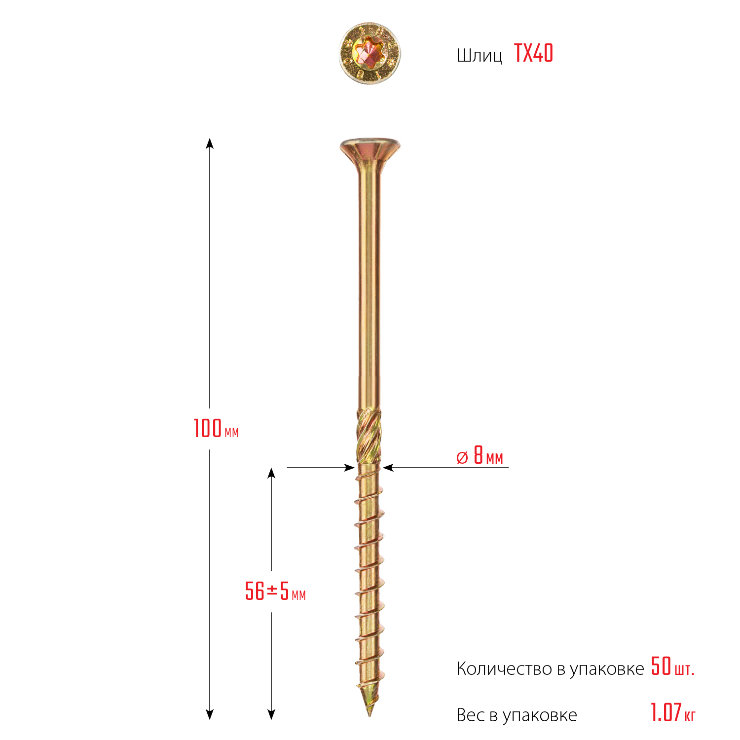 ЗУБР КС-П 100 х 8.0 мм, TX40, потай, конструкционный саморез, желтый цинк, 50 шт (30041-80-100)