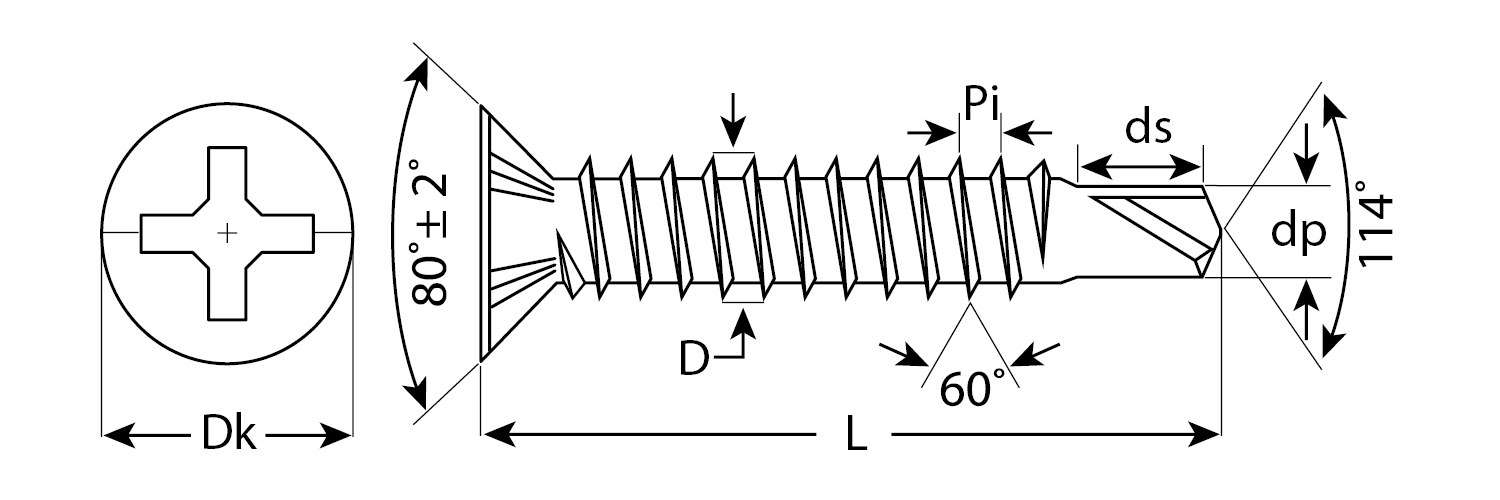 Саморезы со сверлом для оконного профиля изготовлены из стального прутка с высоким содержанием углерода. Контроль за геометрией самореза начинается с калибровки прутка и заканчивается тщательной проверкой размеров готового изделия. Нормативная твердость стали достигается термической обработкой. Поверхностная твердость 550-720HV, твердость в сердцевине 320-425HV. Саморезы легко вкручиваются обычным шуруповертом или отверткой с крестообразным шлицем PH2 (DIN). Предварительное сверление в скрепляемых материалах не требуется. Геометрические размеры: диаметр головки (Dk) - 7.14-7.50мм, диаметр резьбы (D) - 3.73-3.91мм, диаметр сверла (dp) - 3.05-3.20мм, длина сверла (ds) - 4.4мм, шаг резьбы (Pi) - 1.4мм.