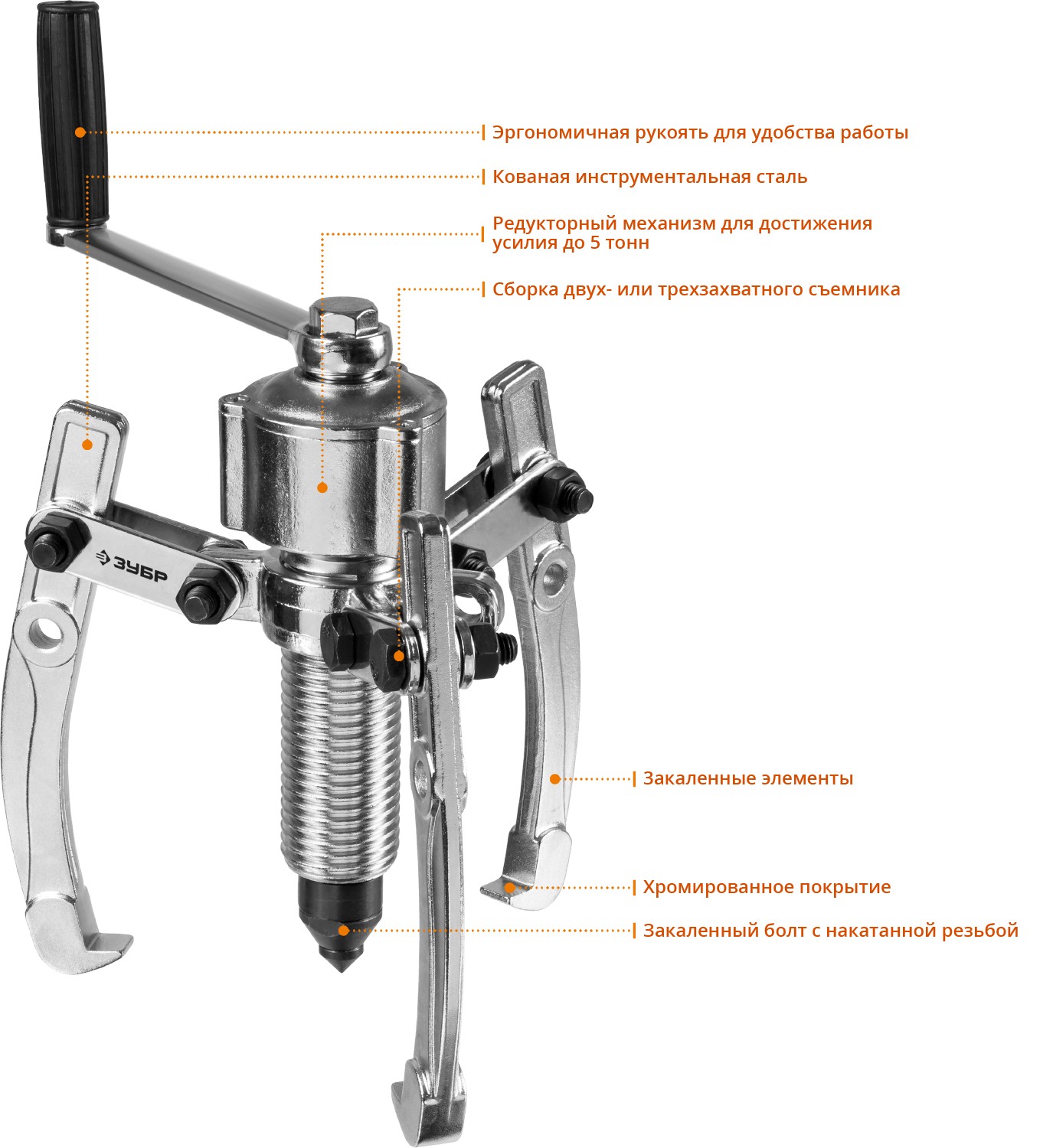 Усиленный съемник применяется для работ с применением повышенных нагрузок. Тяговое усилие до 5 т.