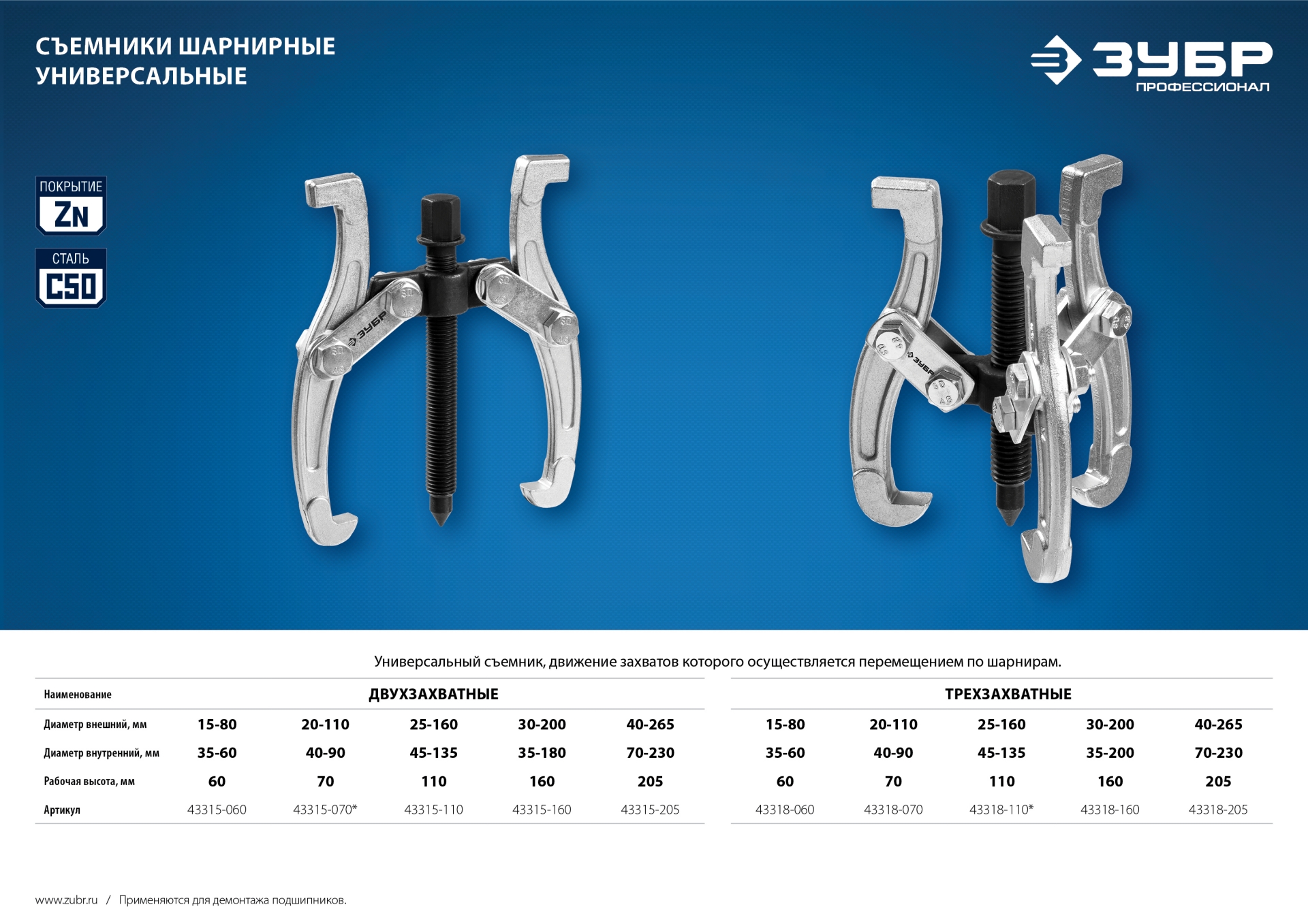 ЗУБР внешний d 20-110 мм, внутренний d 40-90 мм, Шарнирный трехзахватный съемник внешний, Профессионал (43318-070)