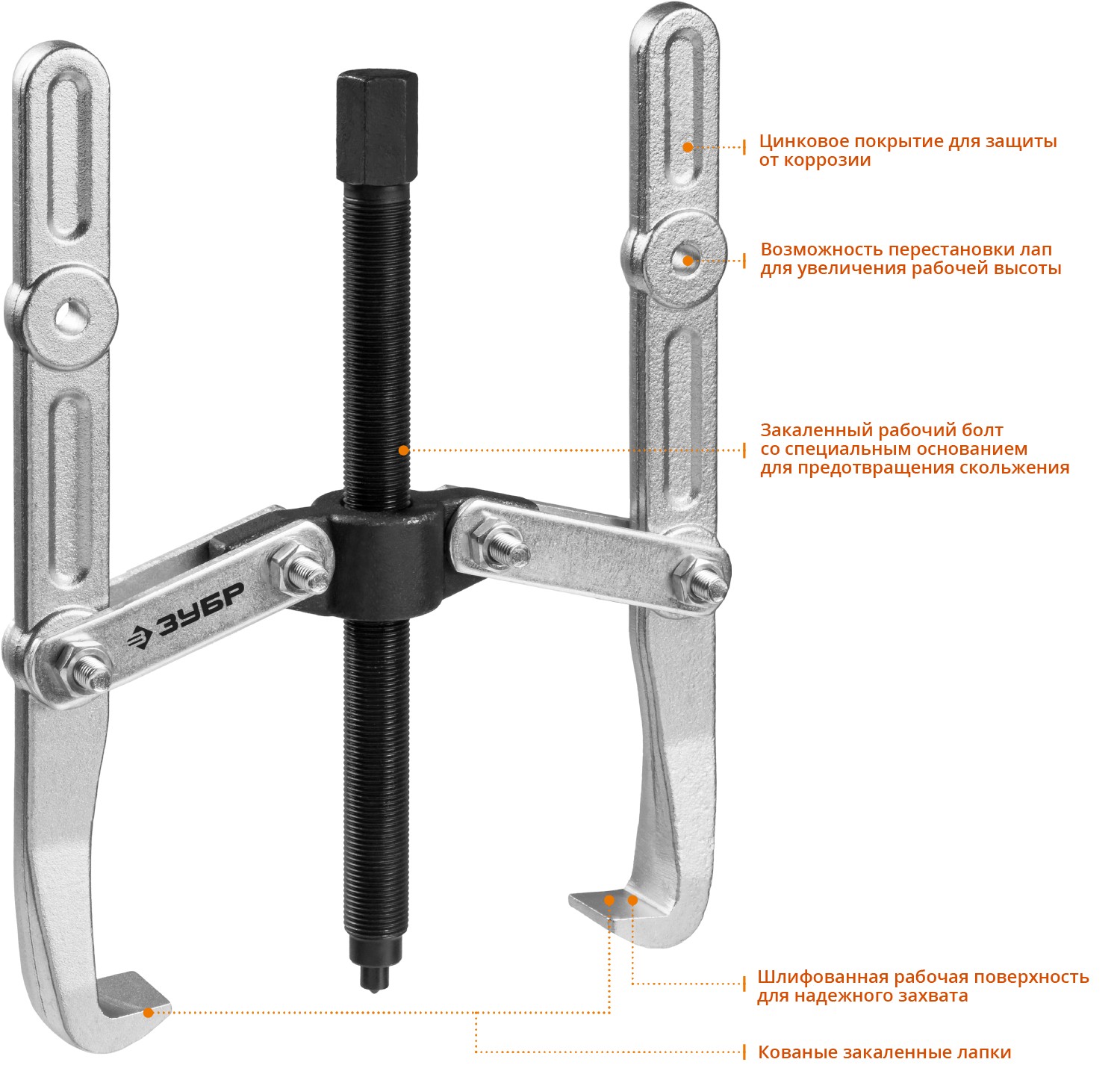 ЗУБР внешний d 36-250 мм, внутренний d 30-200 мм, Шарнирный двухзахватный съемник с удлиненными захватами, Профессионал (43316-240)