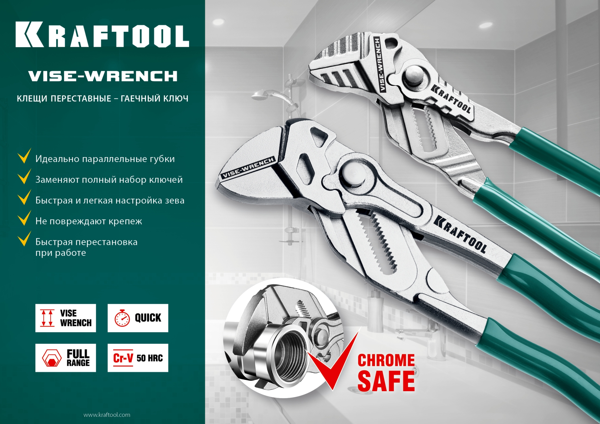 Клещи переставные-гаечный ключ KRAFTOOL – профессиональный инструмент с постоянно параллельными губкам. Заменит набор из всех ключей и обеспечит полную сохранность хромированного крепежа.
